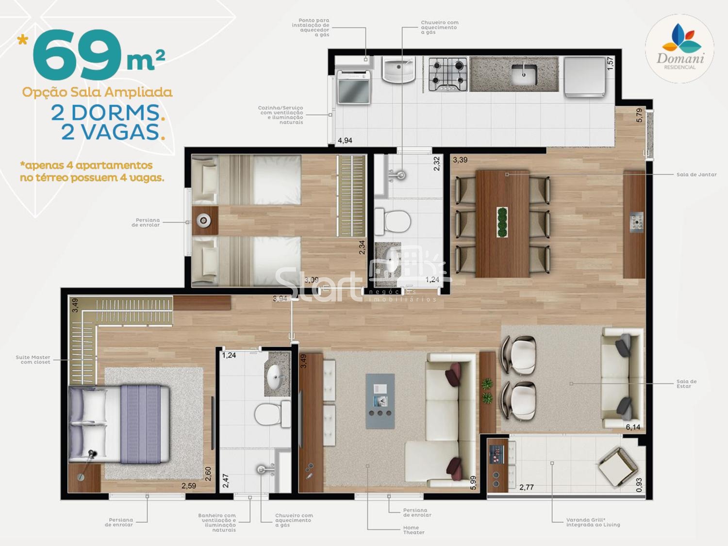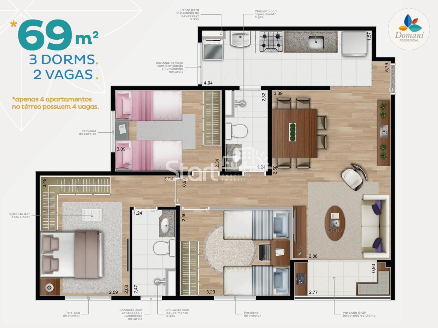 2 vagas de garagem para os apartamentos de 69m² *¹.