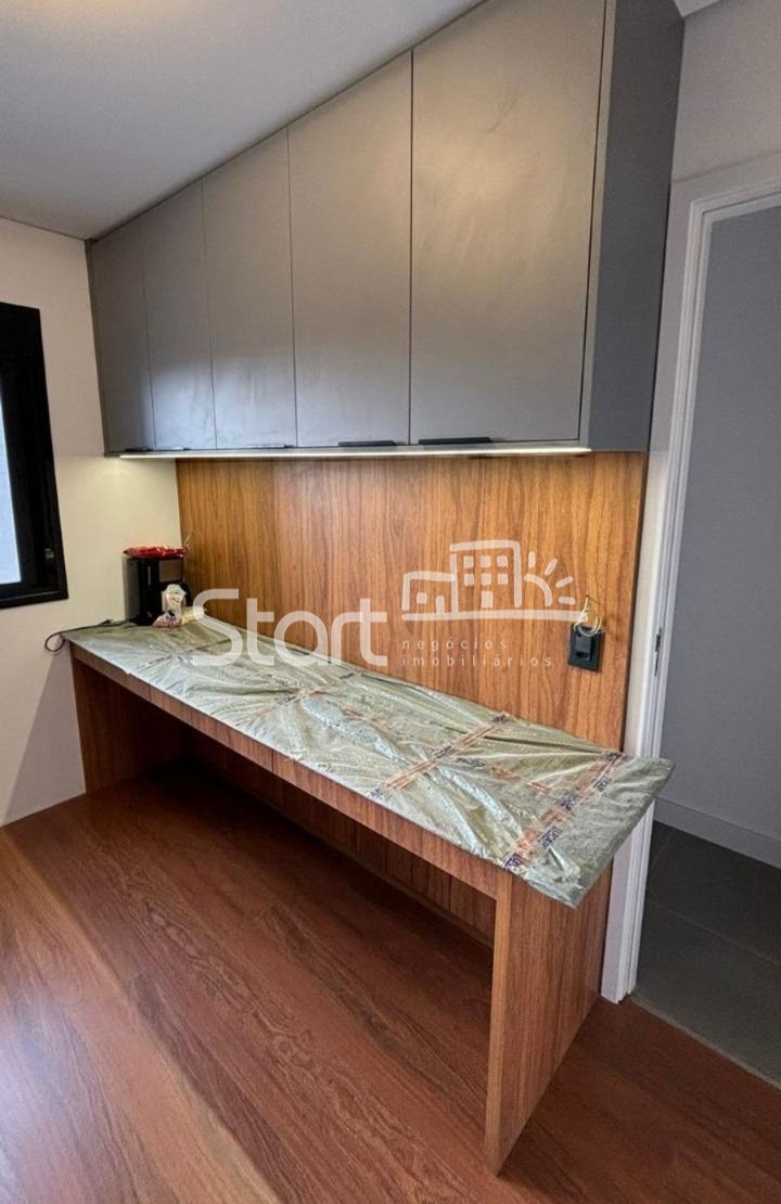 São 3 suítes, sendo 2 com armários planejados, painéis e mesas de cabeceira, e 1 adaptada como escritório com bancada ampla e armário planejado.
