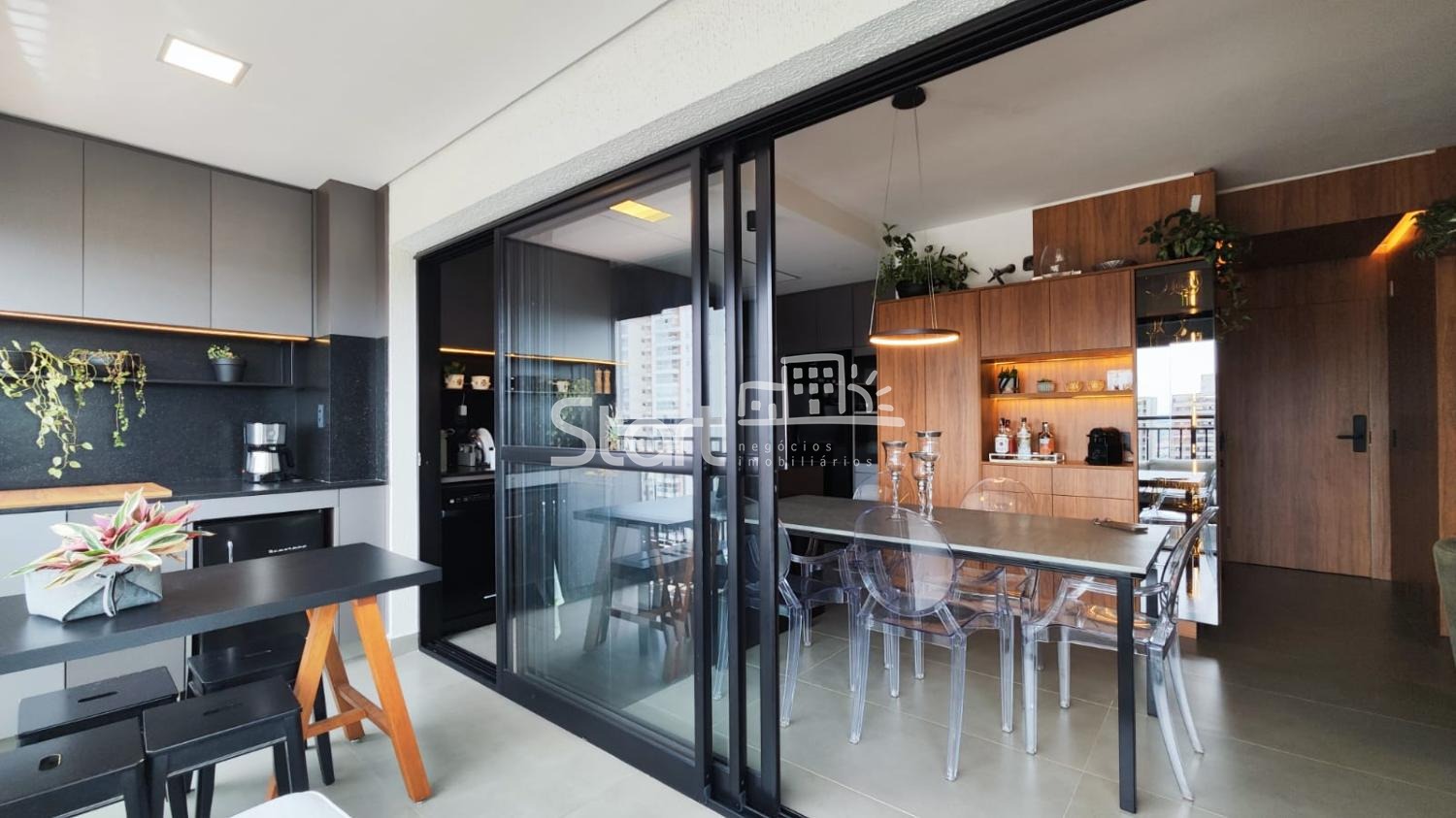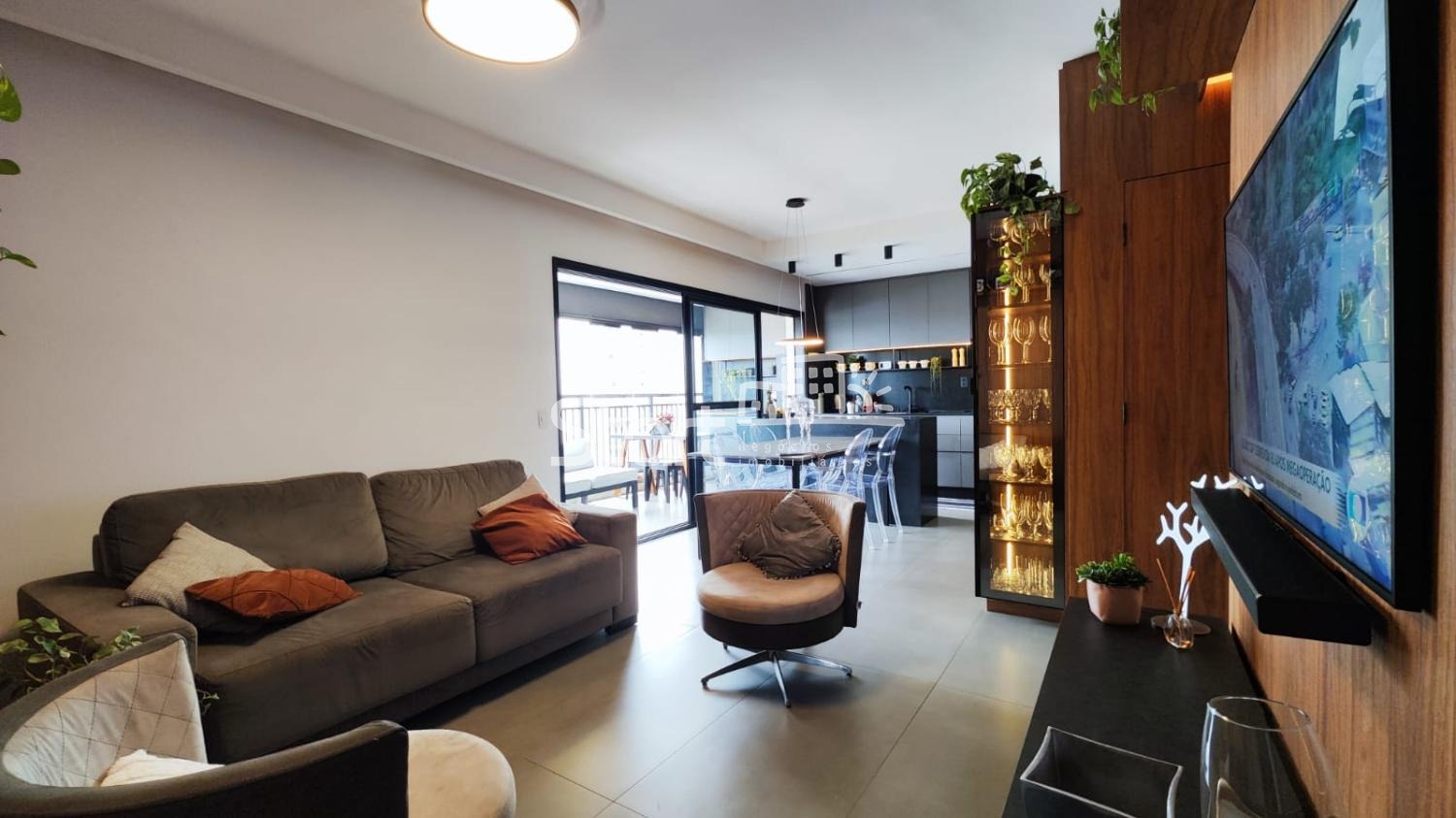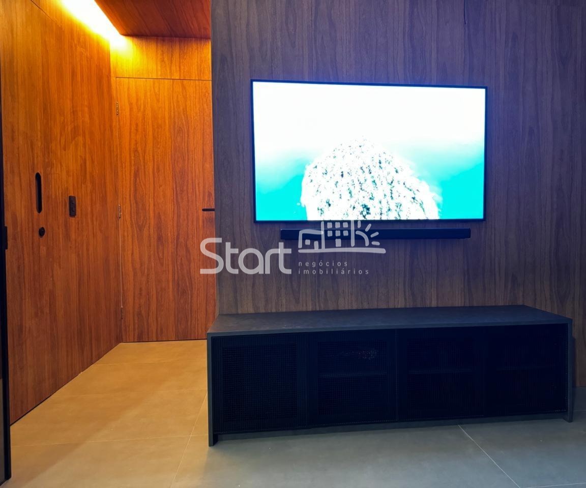 A sala possui painel planejado, marcenaria nas paredes e portas, e acesso à varanda gourmet totalmente envidraçada, com armários planejados.