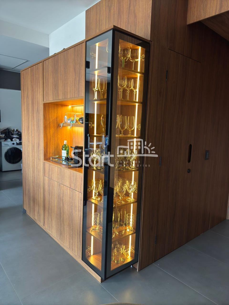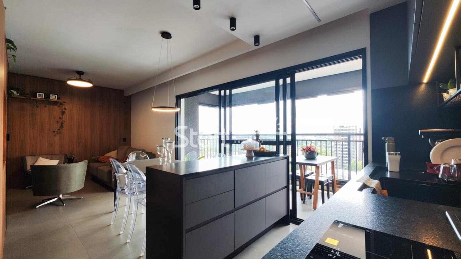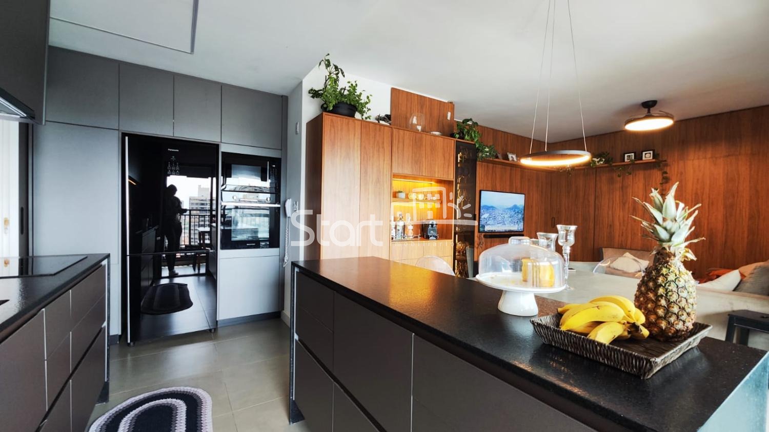 A sala possui painel planejado, marcenaria nas paredes e portas, e acesso à varanda gourmet totalmente envidraçada, com armários planejados.