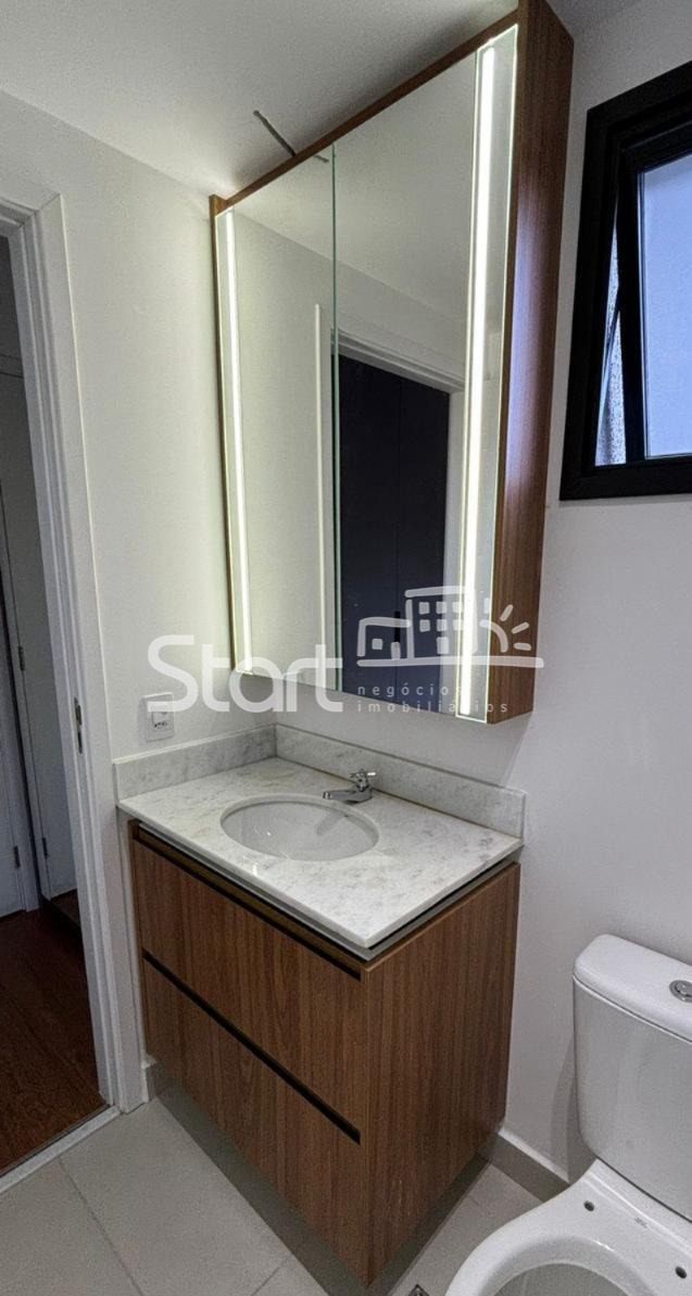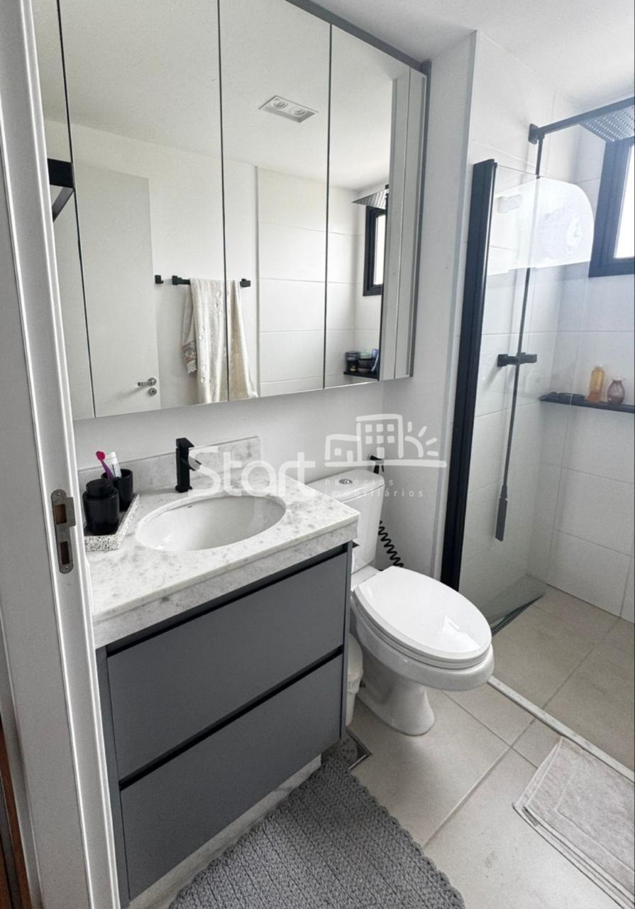 Os banheiros contam com box em vidro, gabinetes e armários aéreos com espelhos e iluminação em LED.