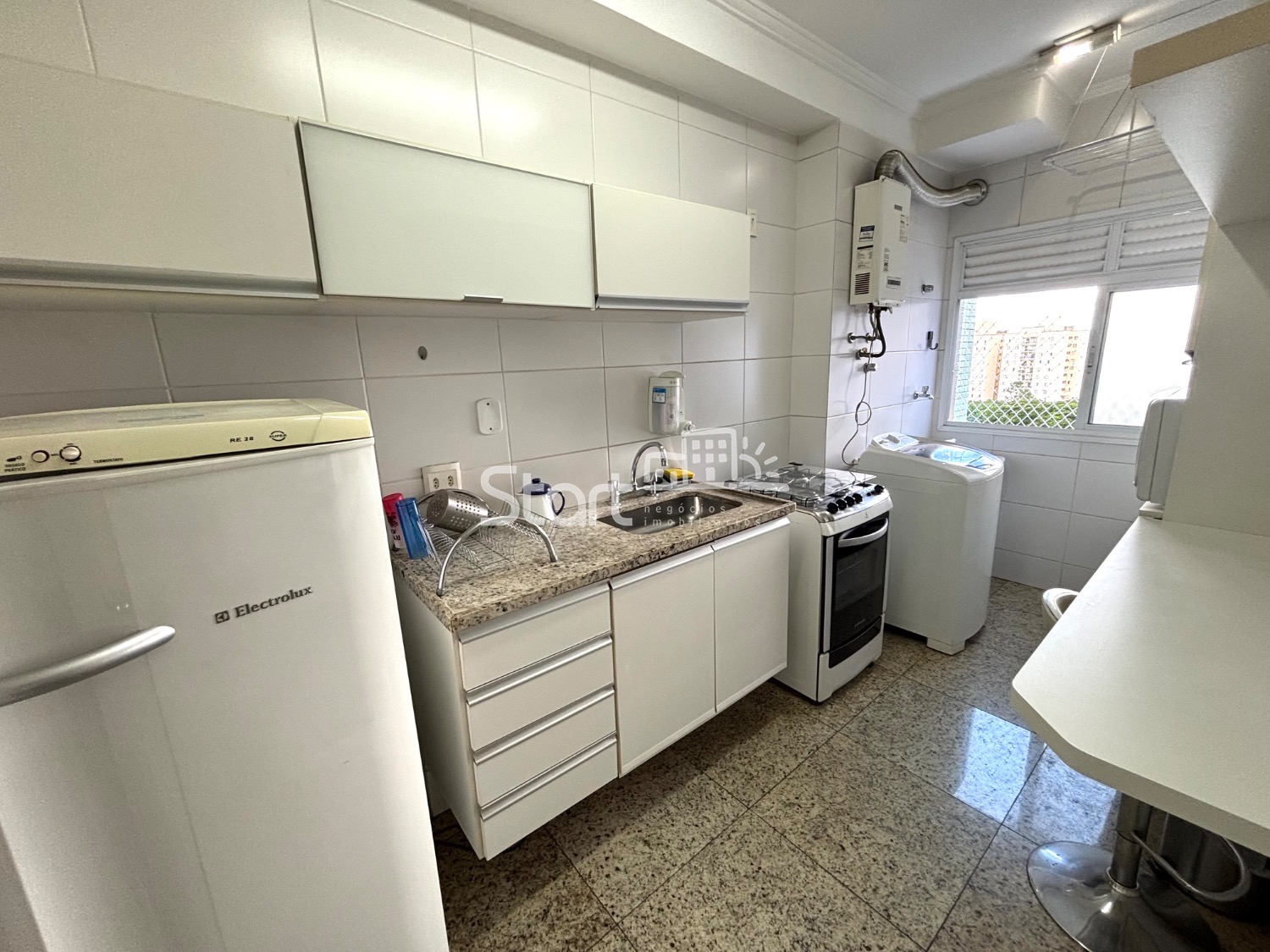 Cozinha americana planejada com geladeira, fogão e microondas, área de serviço com máquina de lavar e armário, aquecimento a gás.