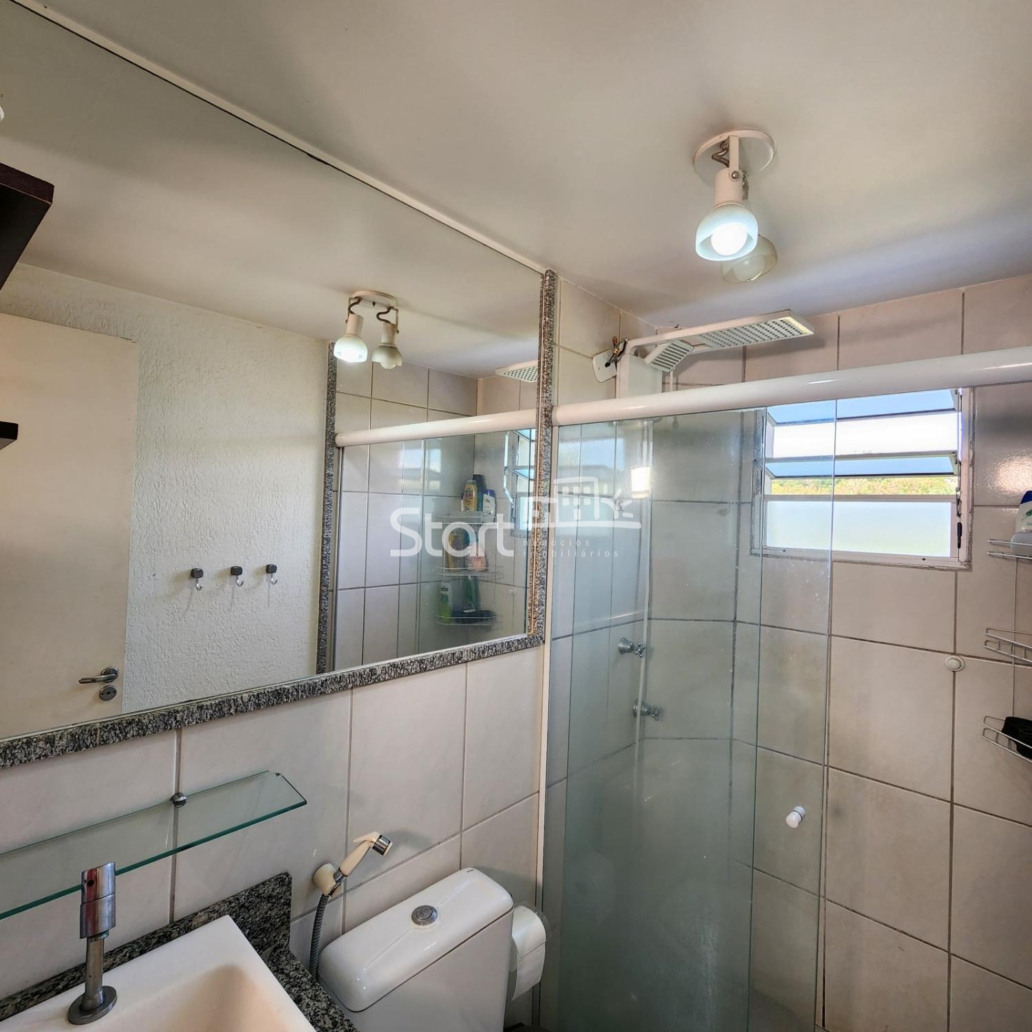 Banheiro: Social, com pia, bancada e box de vidro