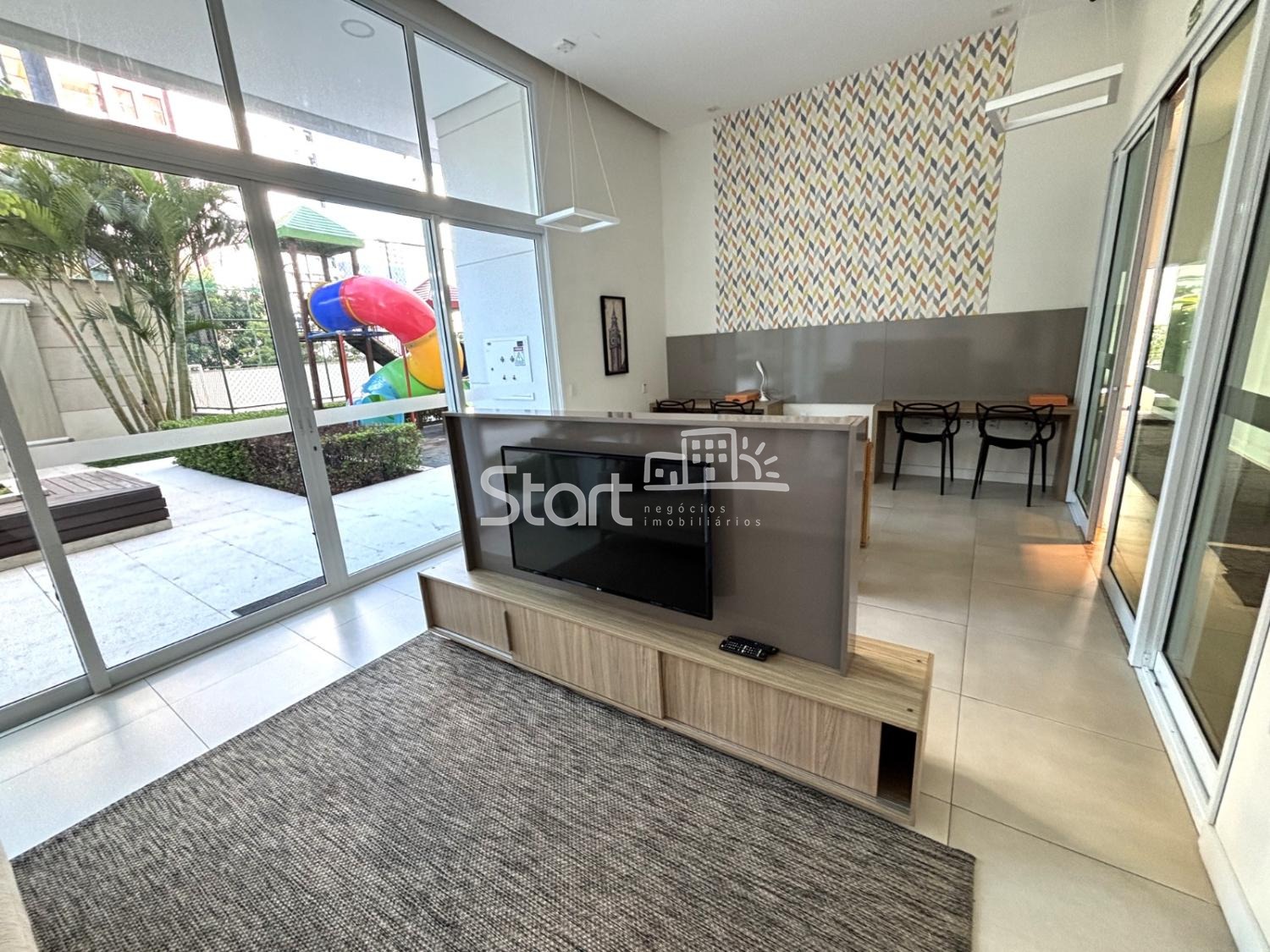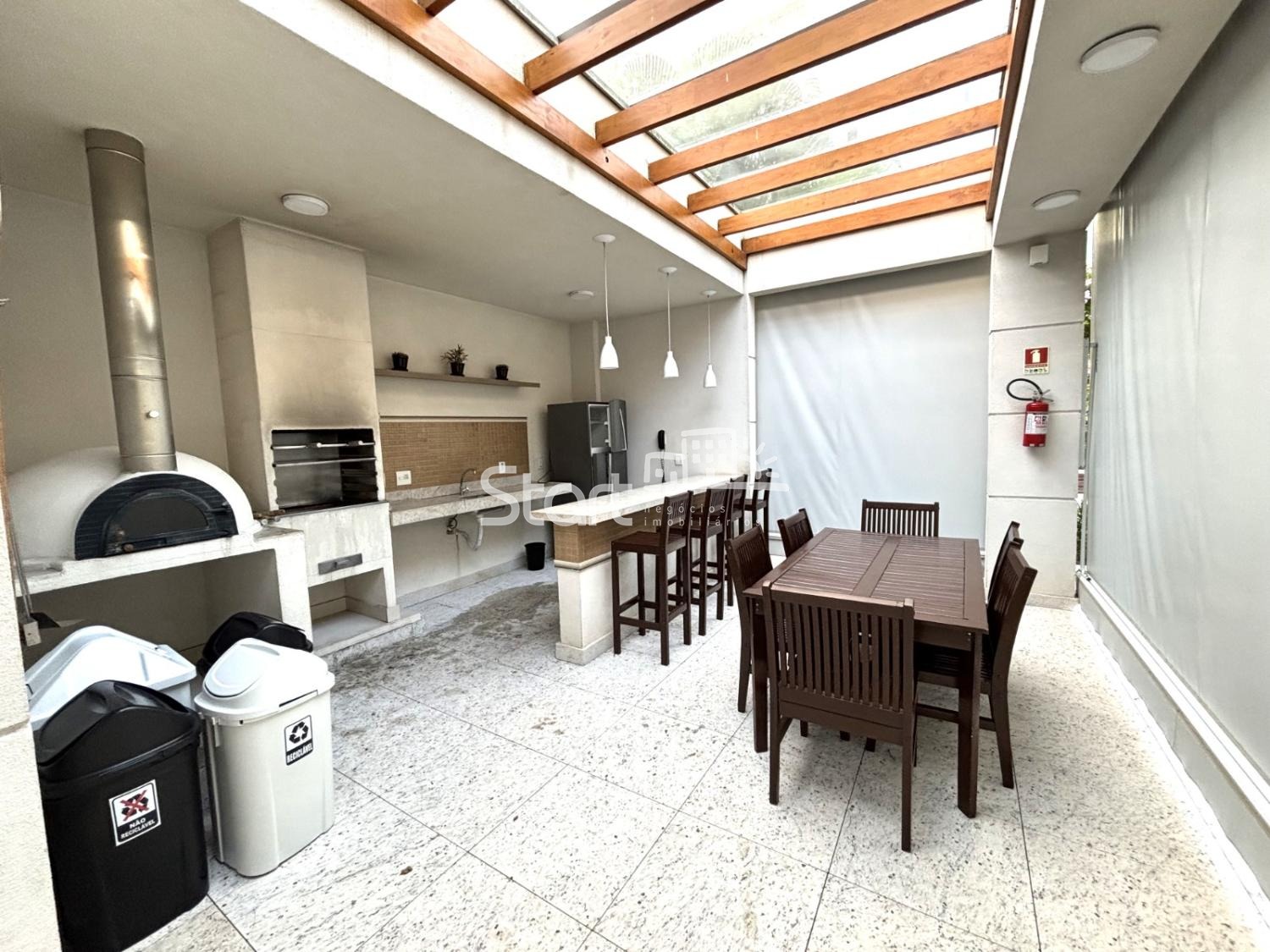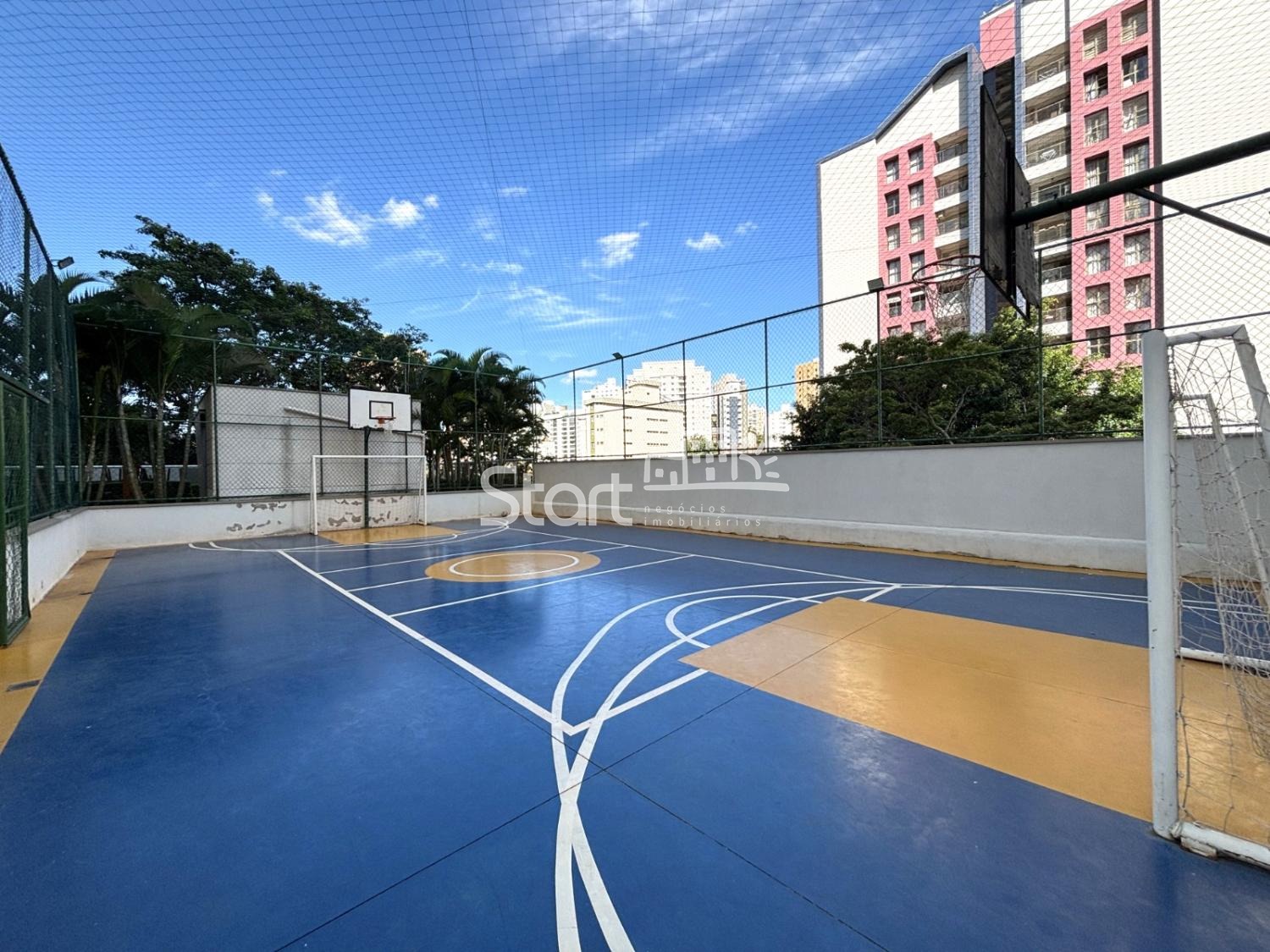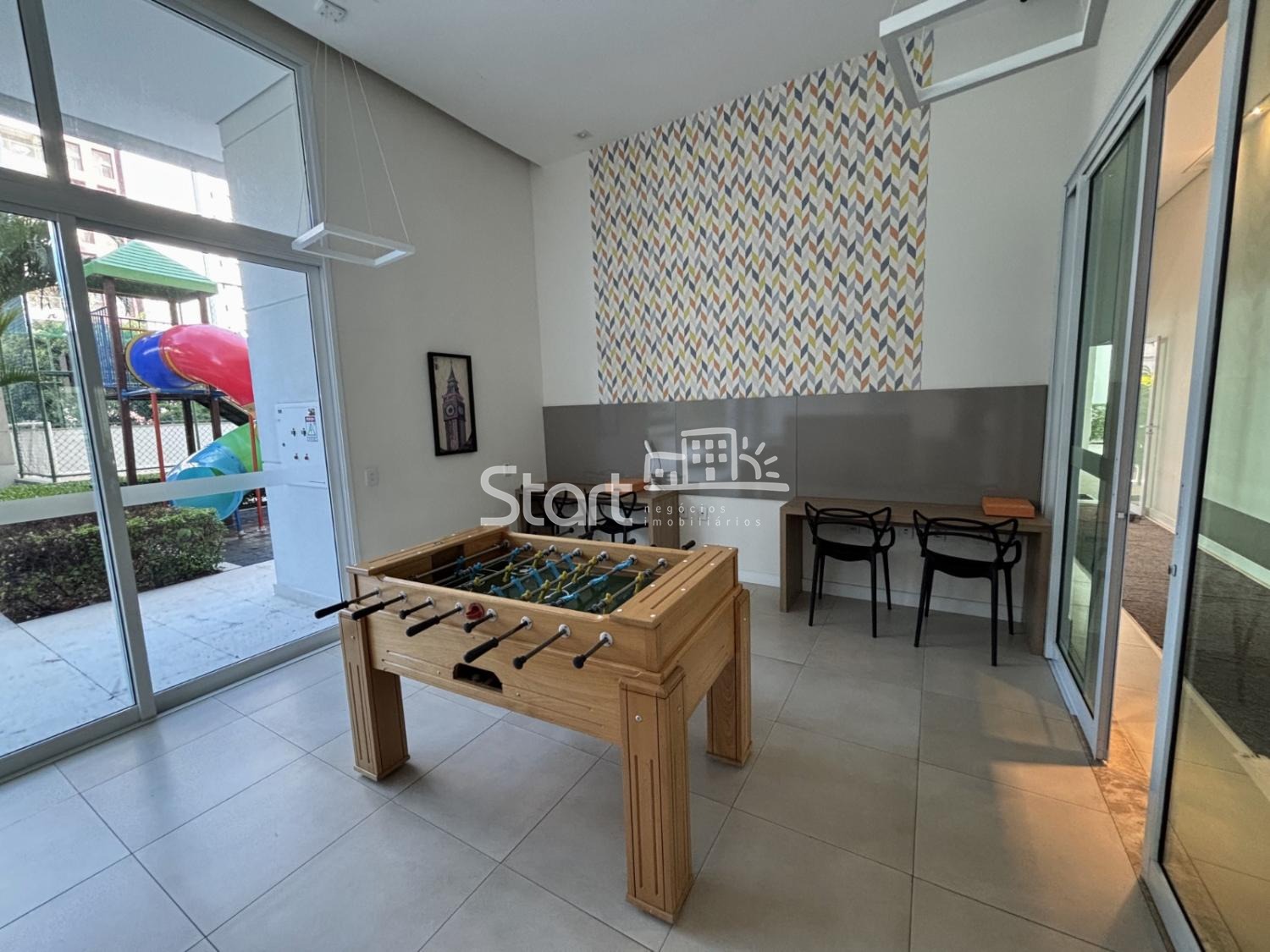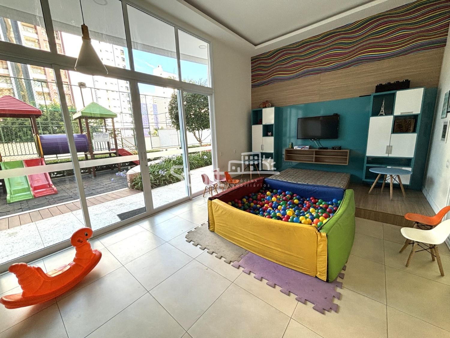 Área de lazer completíssima com salão de jogos, brinquedoteca, playground, quadra, churrasqueira coberta com forno de pizza e piscina.