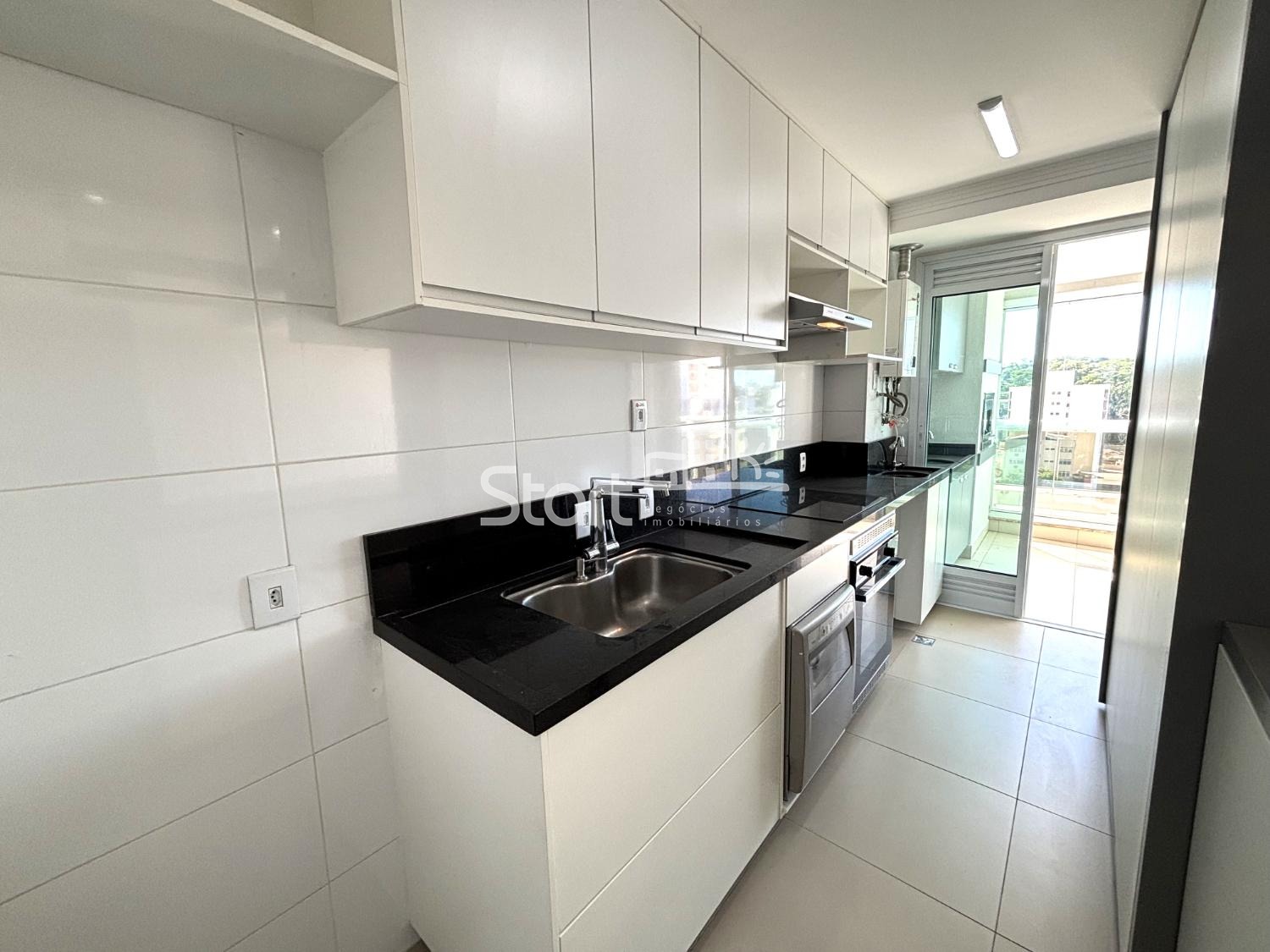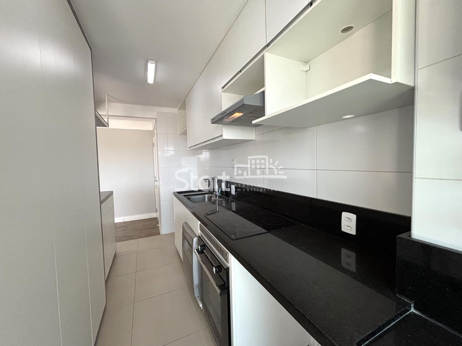 Cozinha americana planejada com cooktop por indução, forno e máquina de lavar louça.