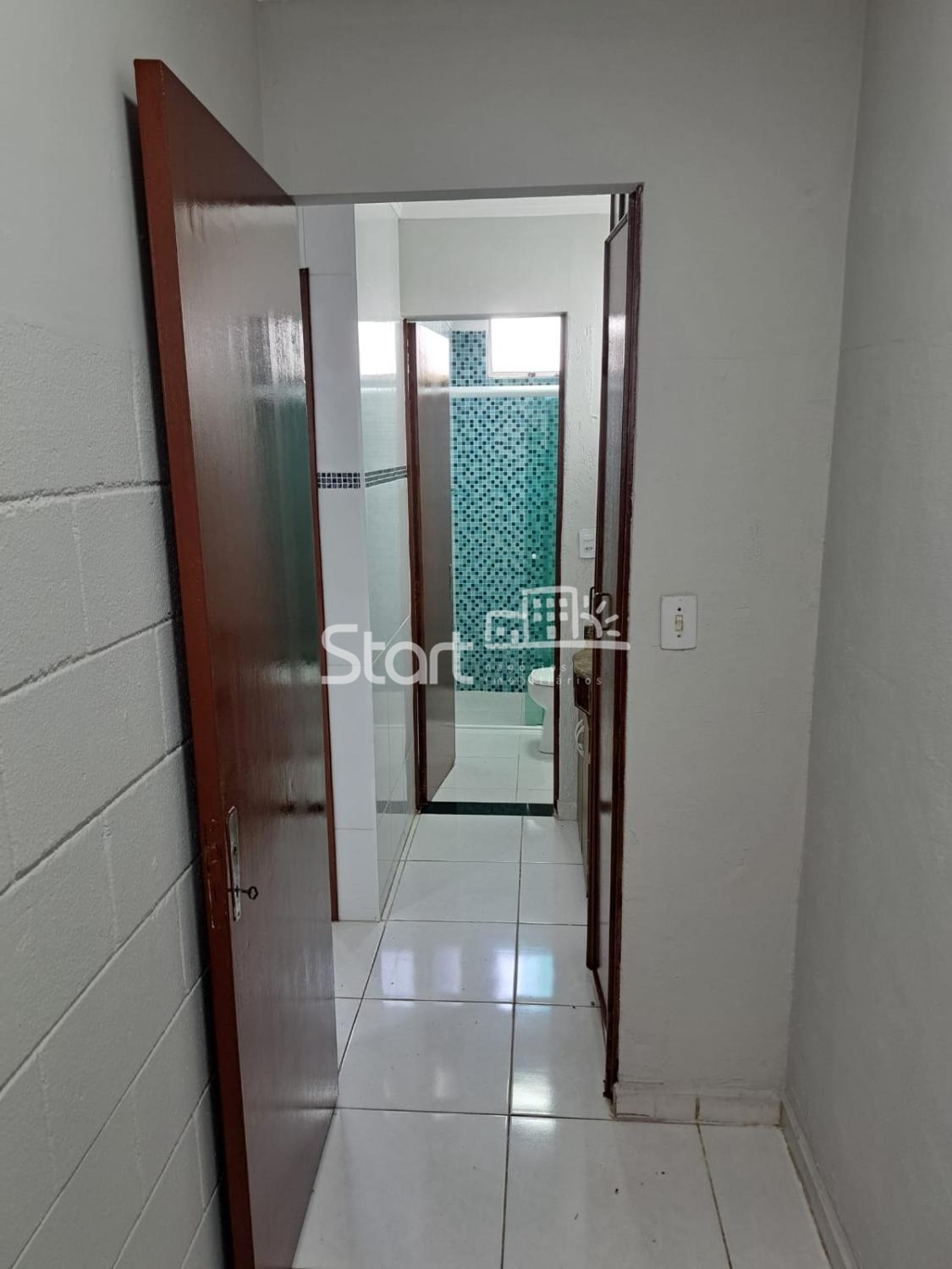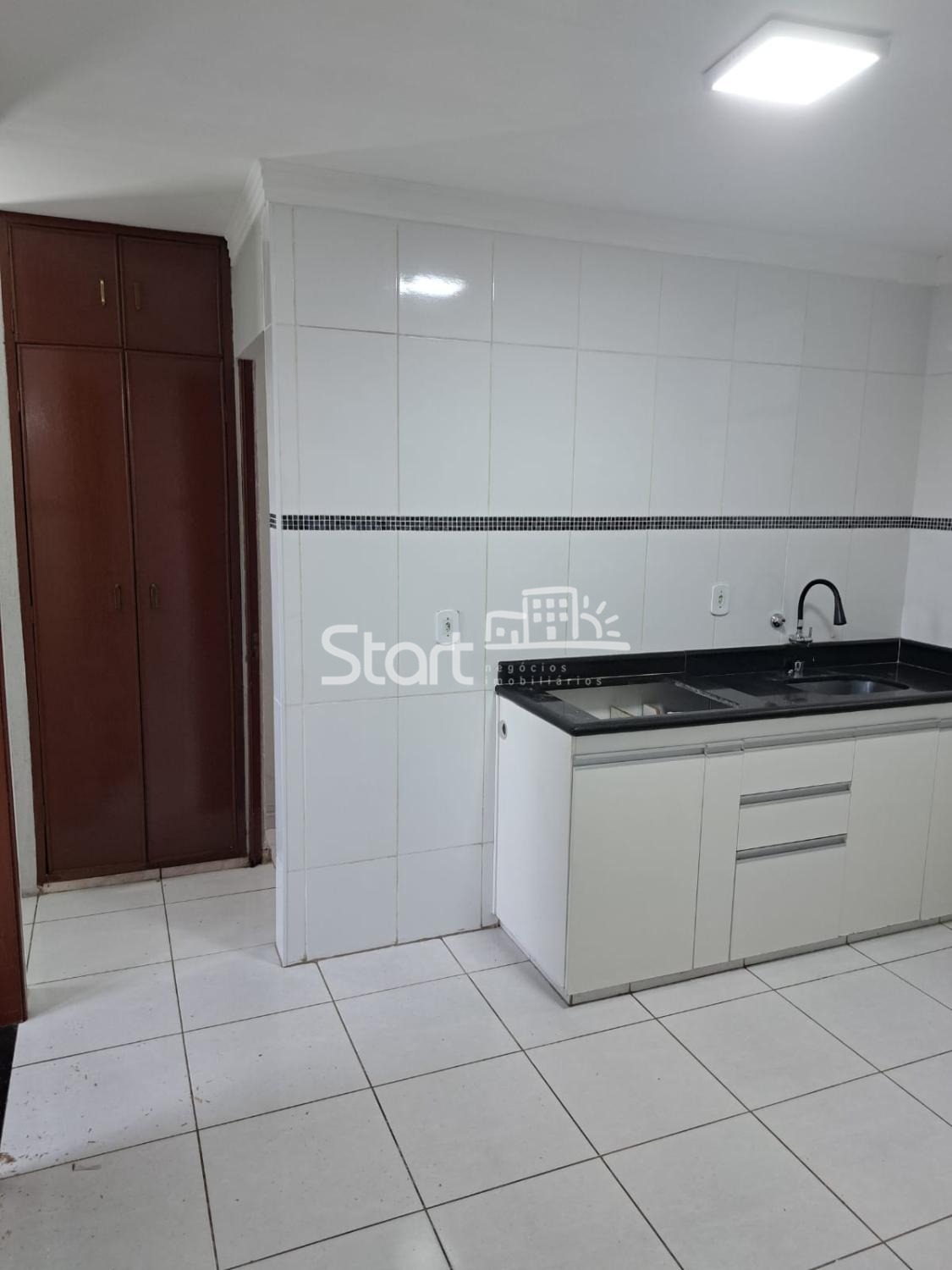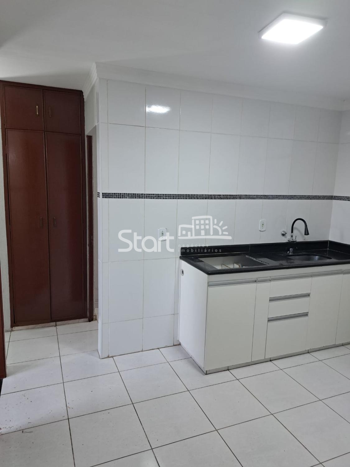 Cozinha e banheiro com revestimento completo.