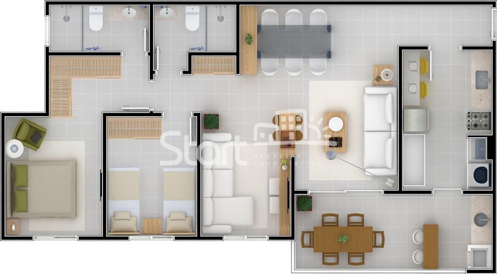São 93 m2, com três quartos, sendo um, suíte com closet e varanda gourmet integrada à cozinha, com churrasqueira. Vaga para 2 Carros.