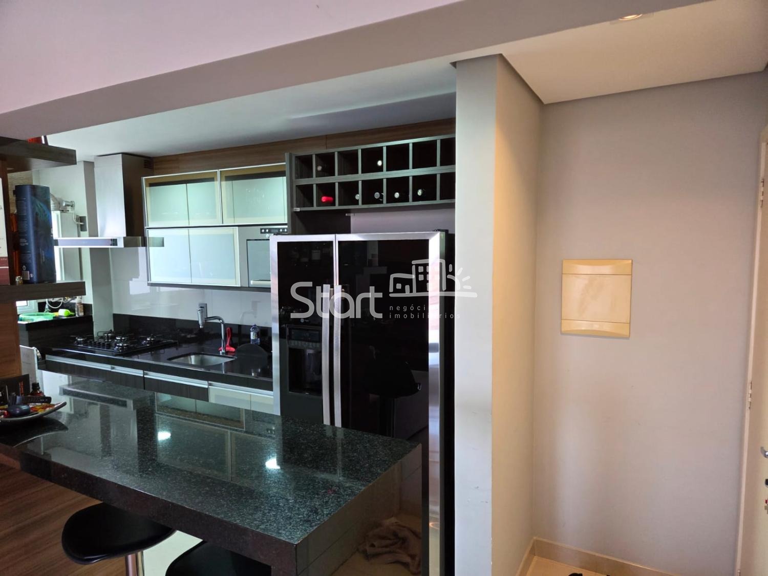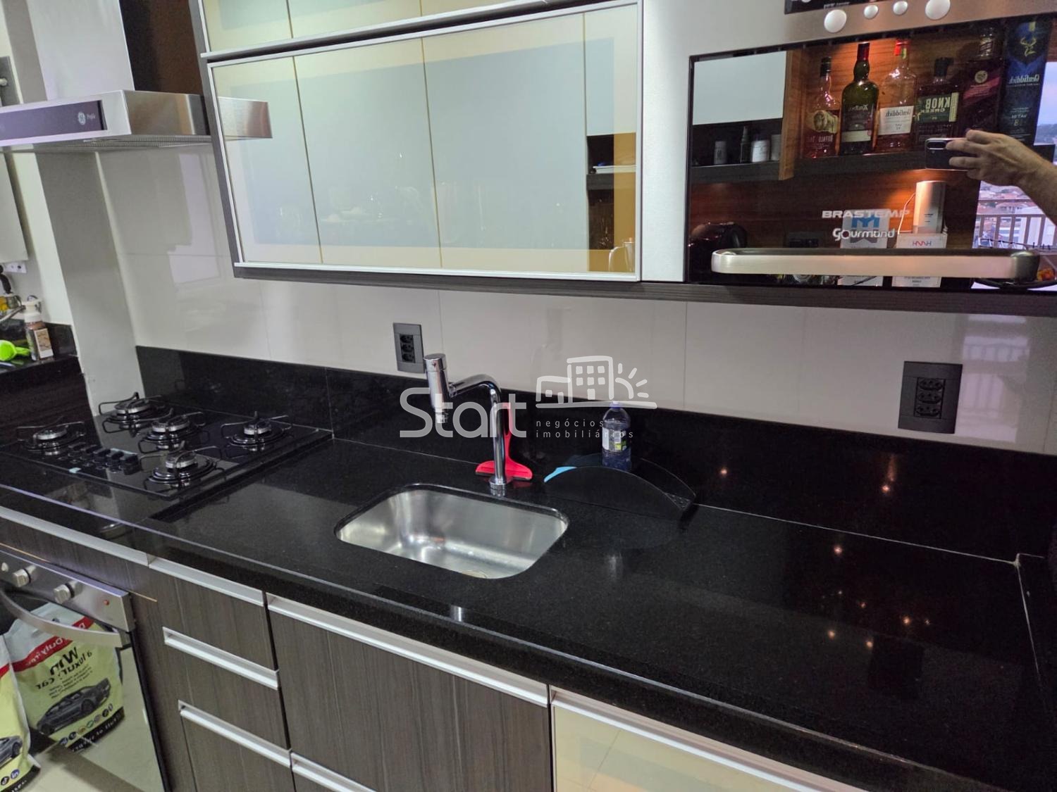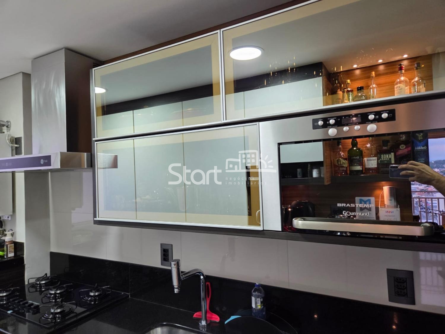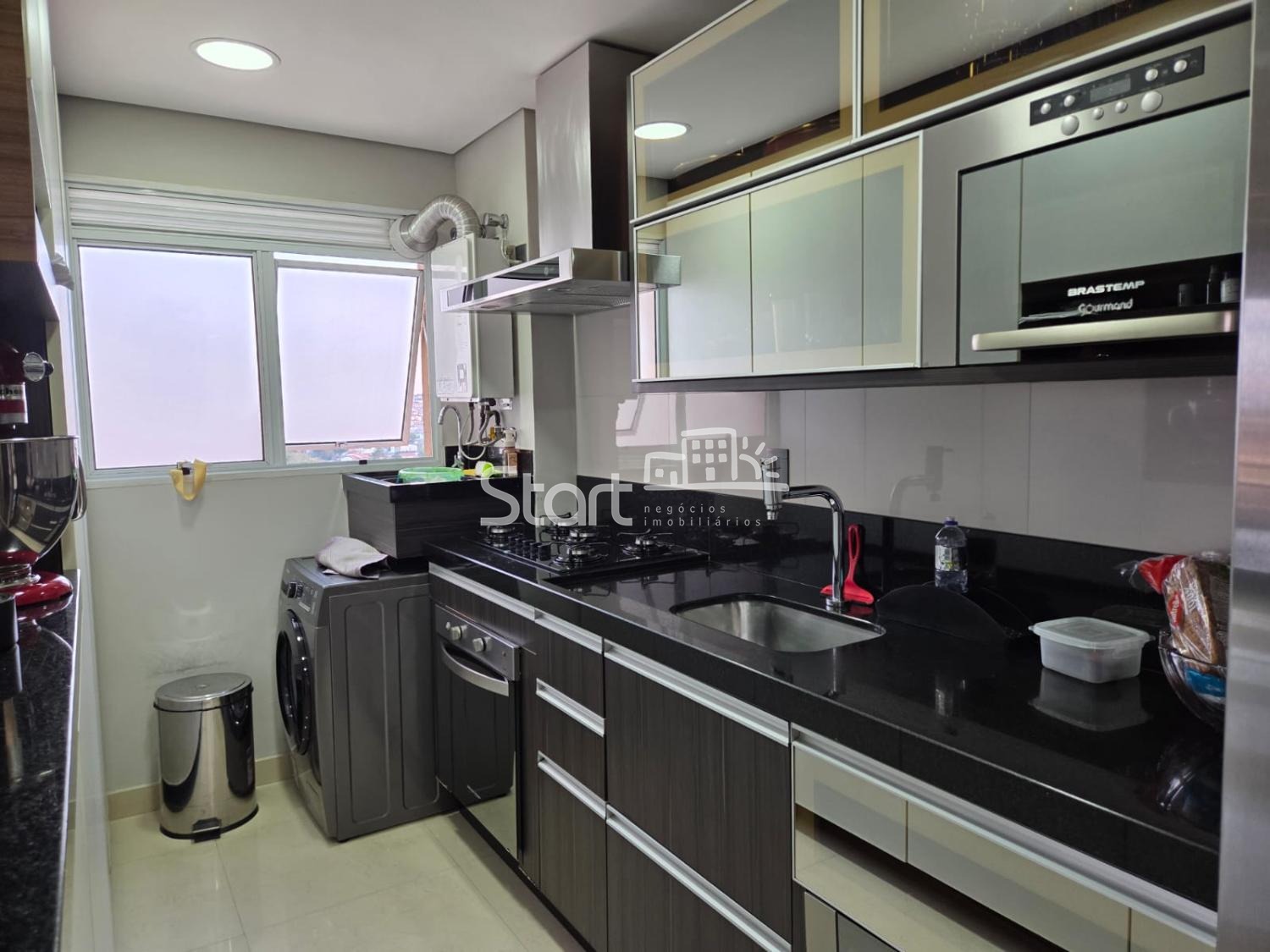 A cozinha vai com forno micro-ondas, forno a gás, lavadora de louças, cooktop 5 bocas (todos esses Brastemp Gourmand) e coifa GE Profile, tudo em bom estado de conservação (podemos negociar a geladeira side-by-side separadamente, GE Profile com portas de vidro preto, em excelente estado de conservação).
