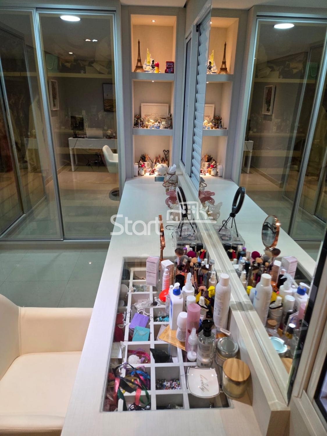 Armários embutidos em todos os cômodos com portas de vidro reflecta.