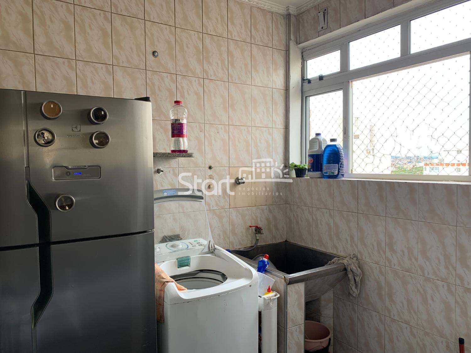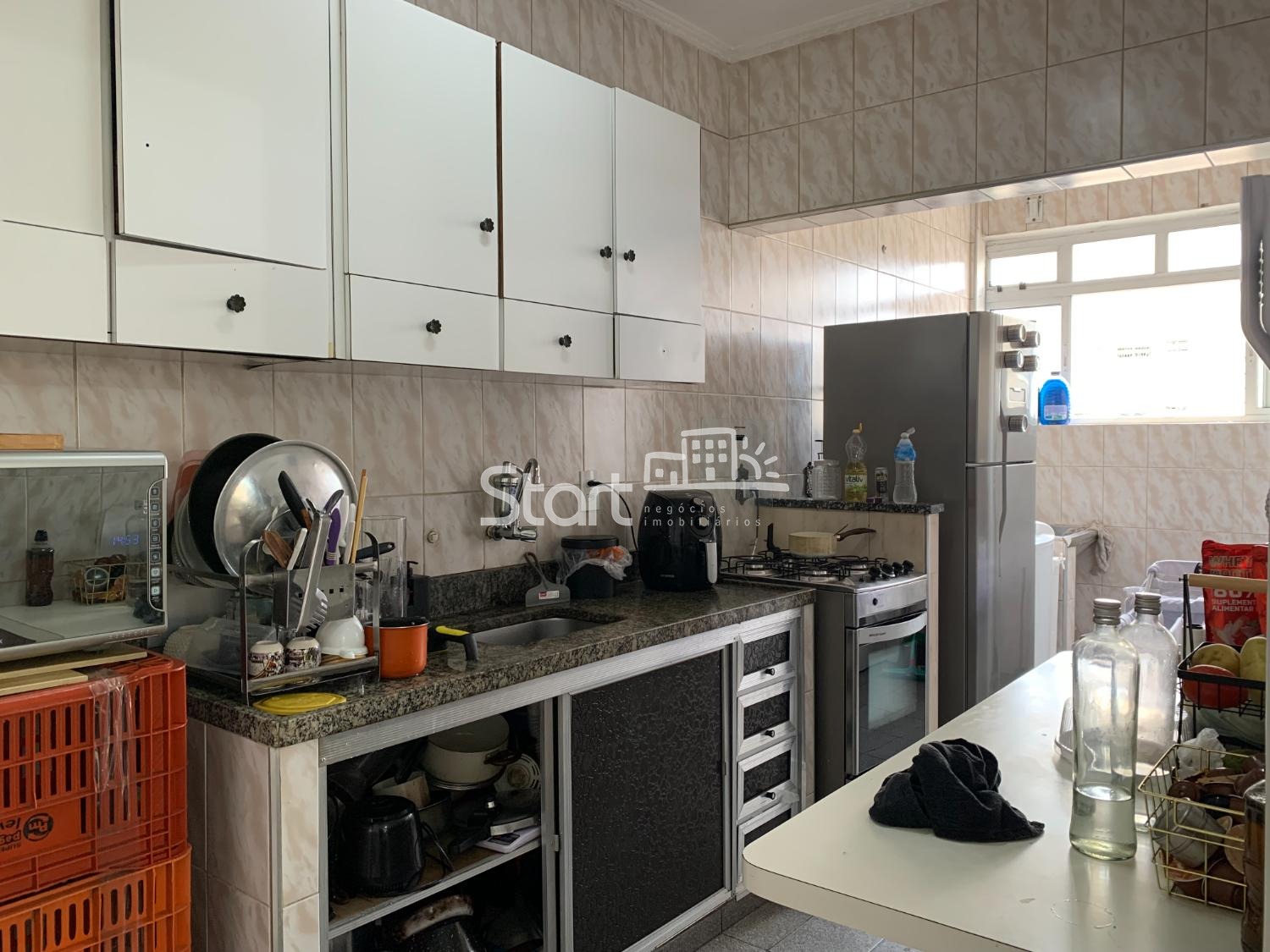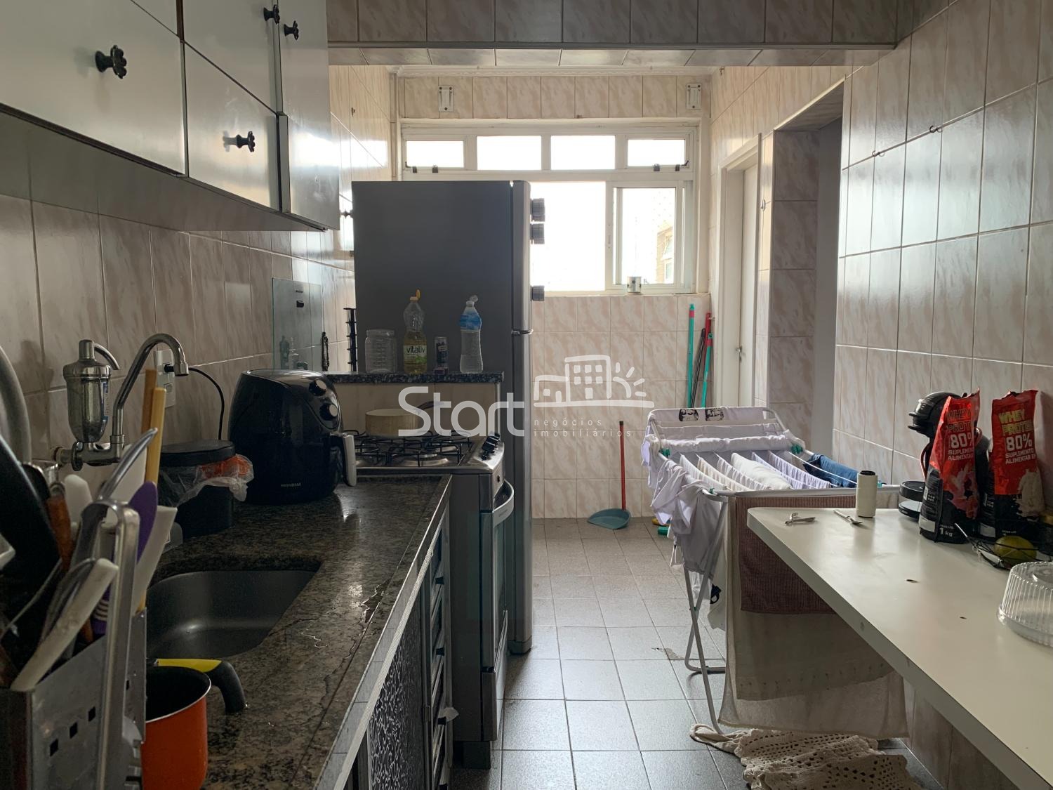 A sala, para 2 ambientes, possui janelas grandes que garantem ótima ventilação. A cozinha é funcional, repleta de armários e integrada à área de serviço, que dispõe de um banheiro auxiliar. Inclui 1 vaga de garagem coberta e livre.