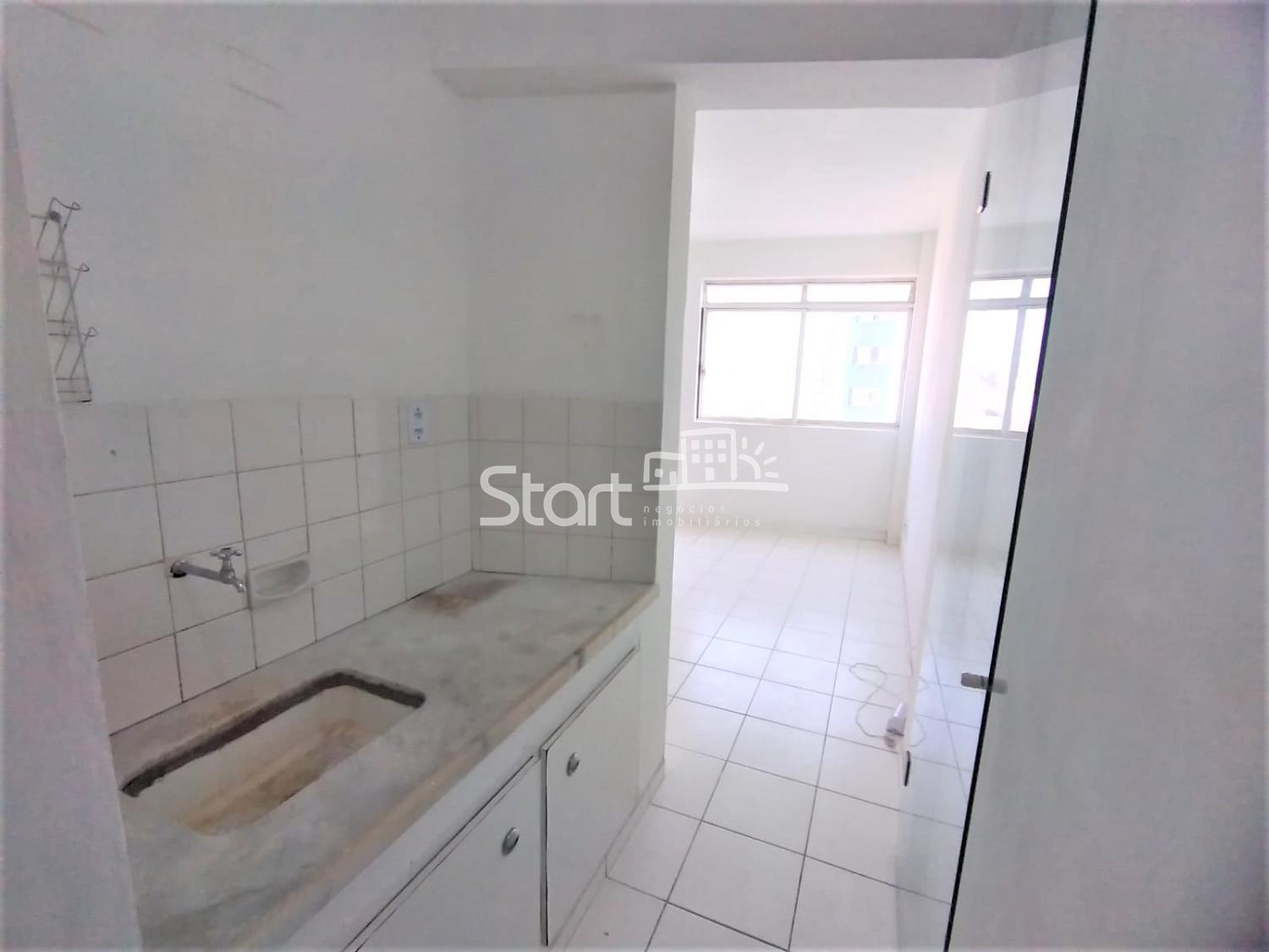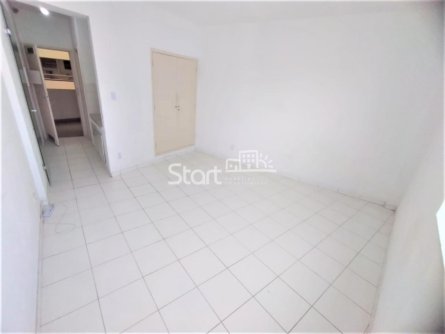 Sem divisória, com sala de estar, cozinha com gabinete, dormitório com armário e banheiro.