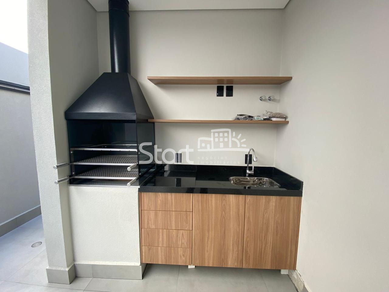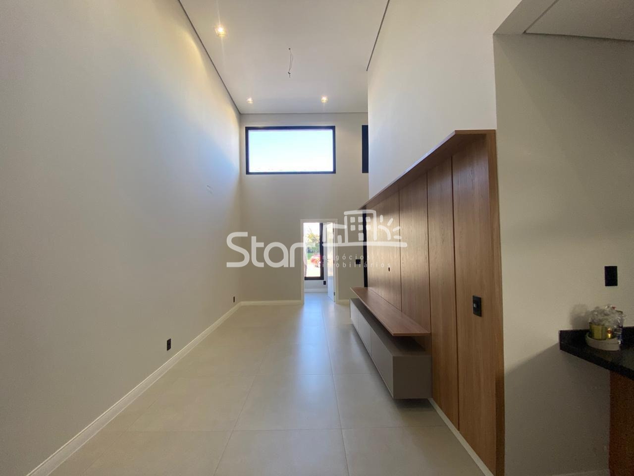Garagem para dois carros, sendo 1 coberta e tomada para carros elétricos, Deposito, escritório, lavanderia espaçosa, sala com pé direito duplo, cozinha integrada, sala de jantar, churrasqueira, portas dos quartos as três com abertura automatizada, preparação para ar condicionado nos quartos, sala e escritório. Aquecimento por boiler.