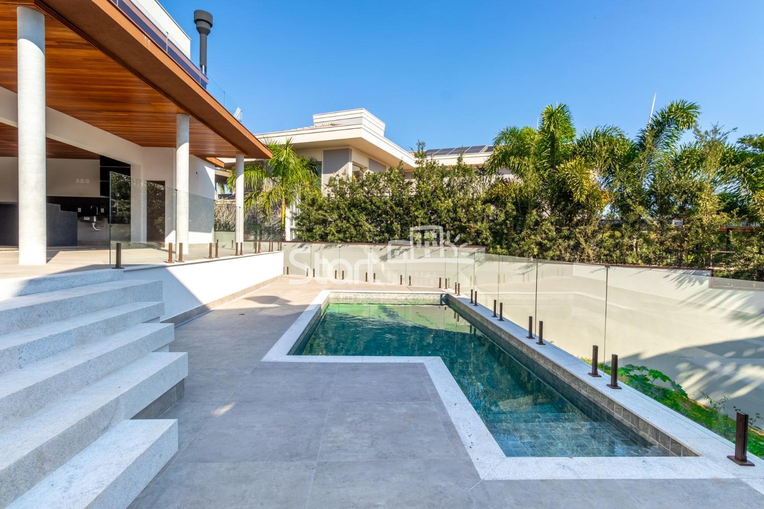 Hall de entrada, Lavabo, Sala de TV, Sala de estar, Sala de jantar, Cozinha, Despensa, Área de serviço com lavanderia e banheiro, Área gourmet com banheiro de apoio, Lazer com piscina.
