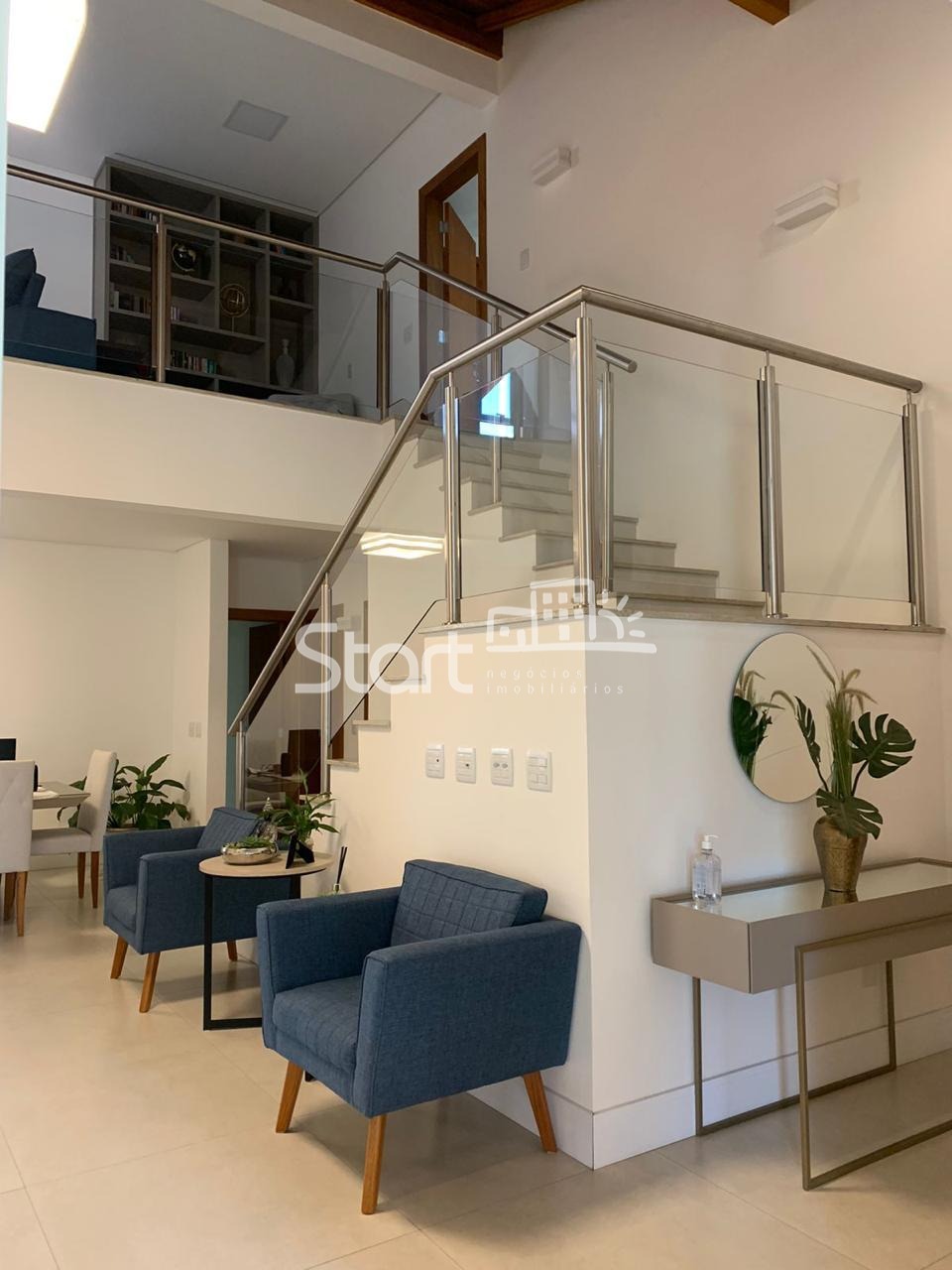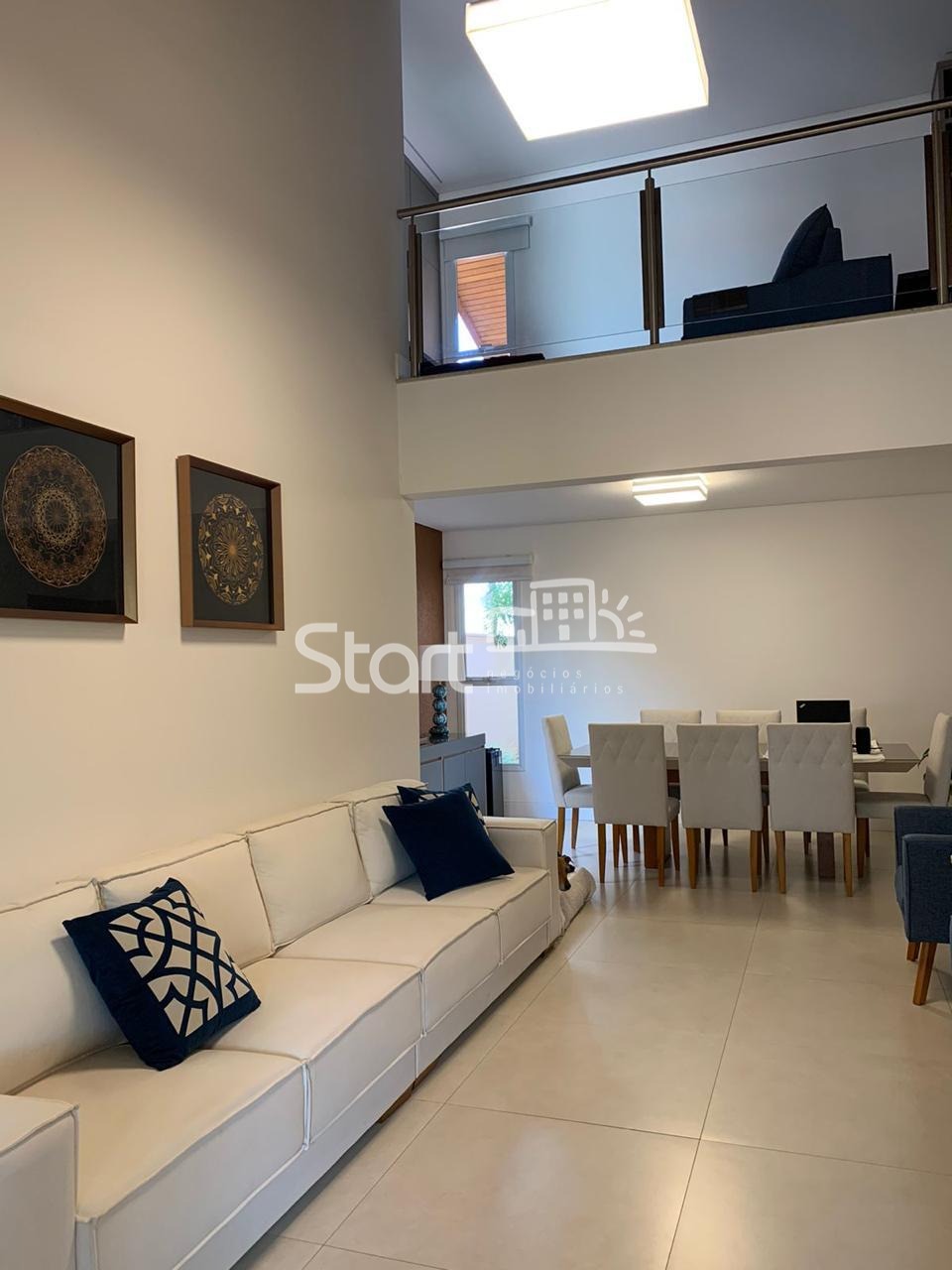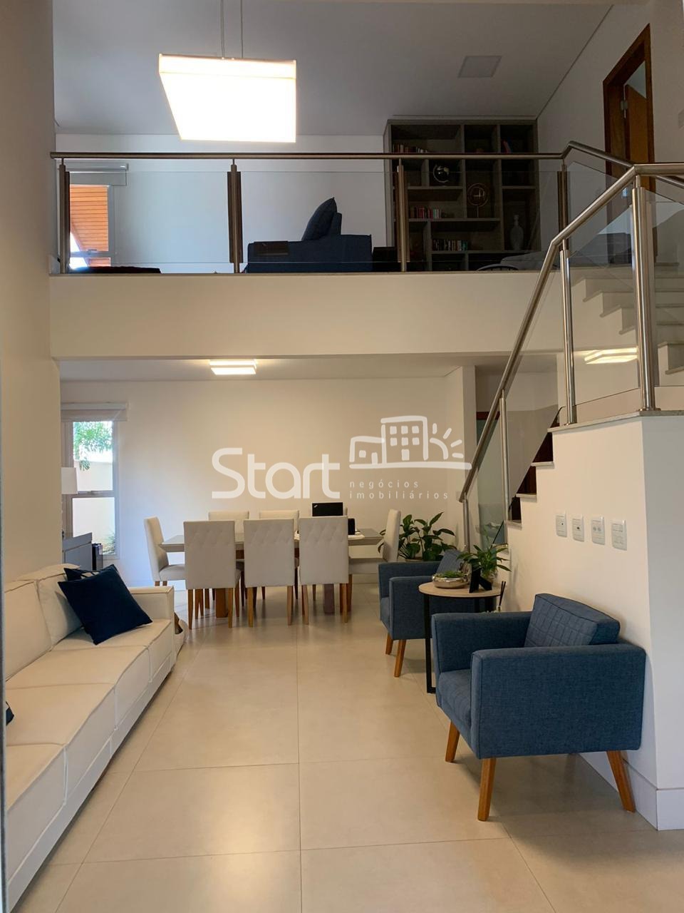O living é amplo, com dois ambientes integrados, lavabo e um mezanino com home theater, perfeito para momentos de lazer em família.