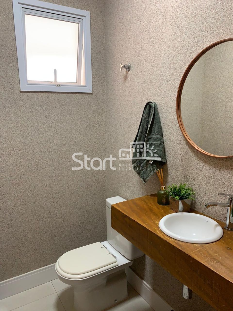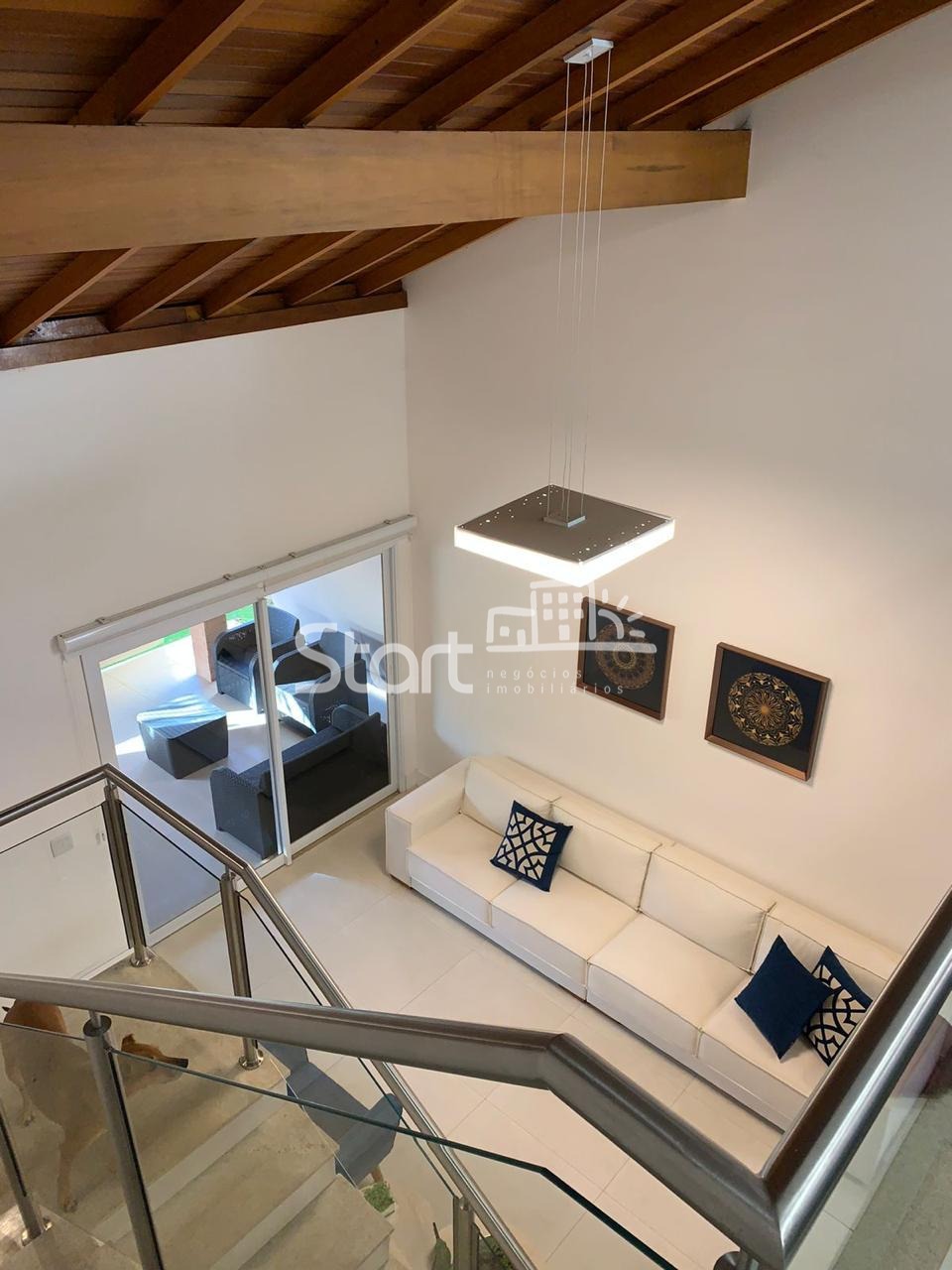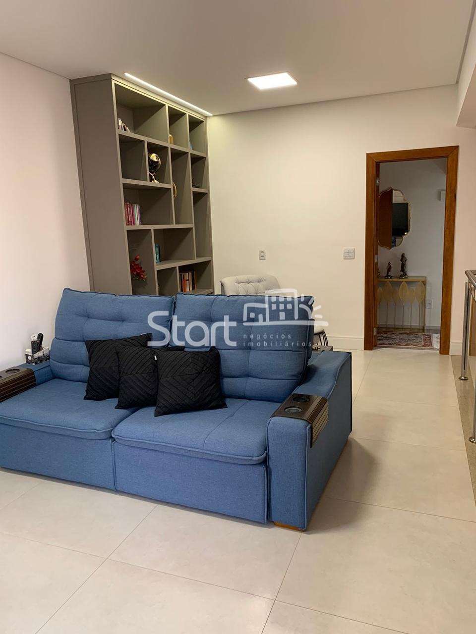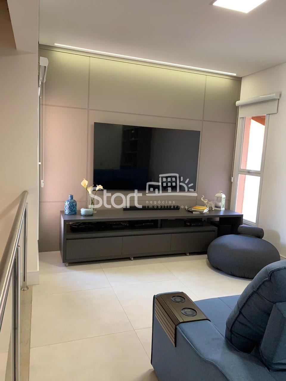 O living é amplo, com dois ambientes integrados, lavabo e um mezanino com home theater, perfeito para momentos de lazer em família.