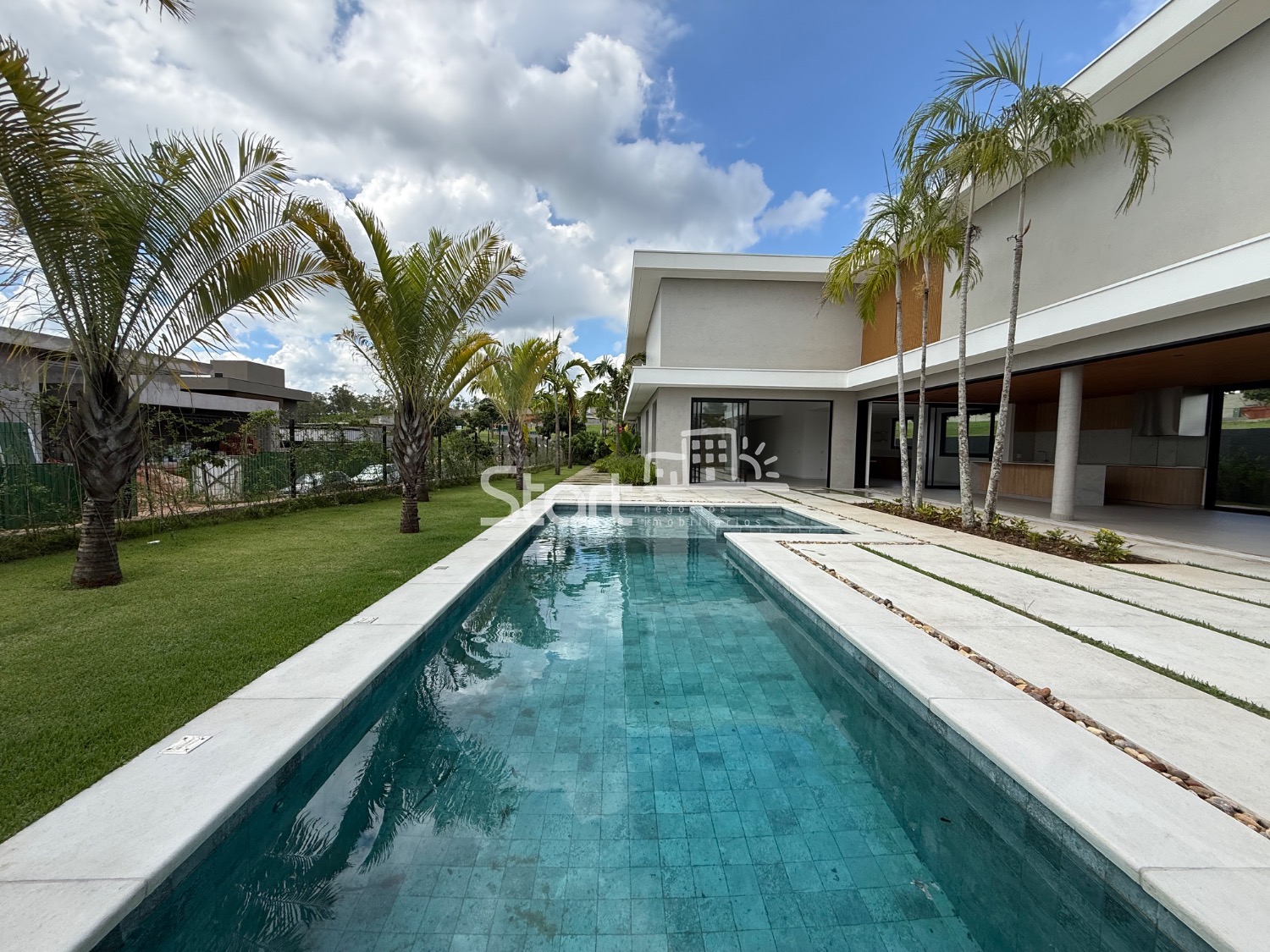 Sobrado com living para 3 ambientes e pé direto, sendo integrada com cozinha planejada, despensa e área gourmet, lavabo, escritório, elevador, quintal amplo com paisagismo e gramado, lavanderia planejada, suíte de serviço, piscina, 06 vagas de garagem aproximadamente.