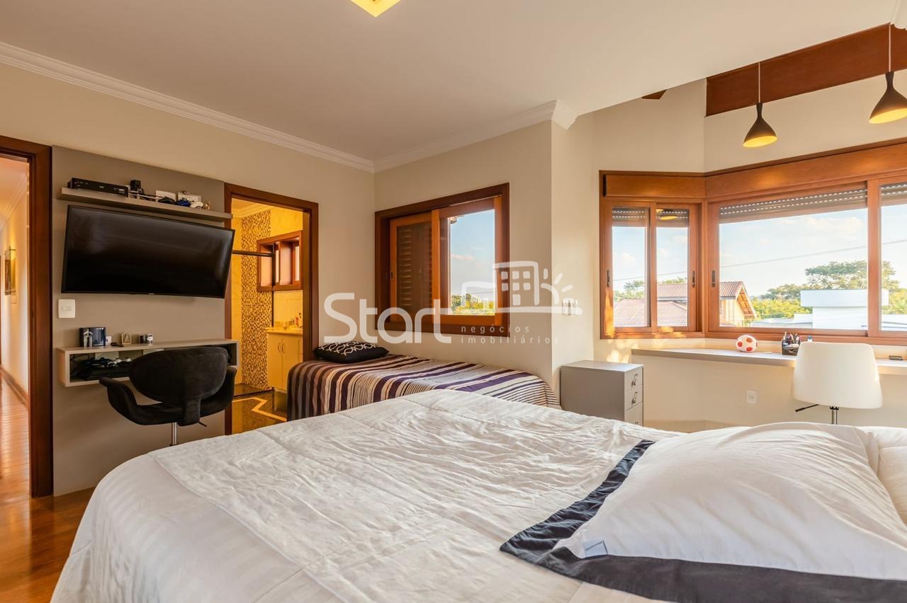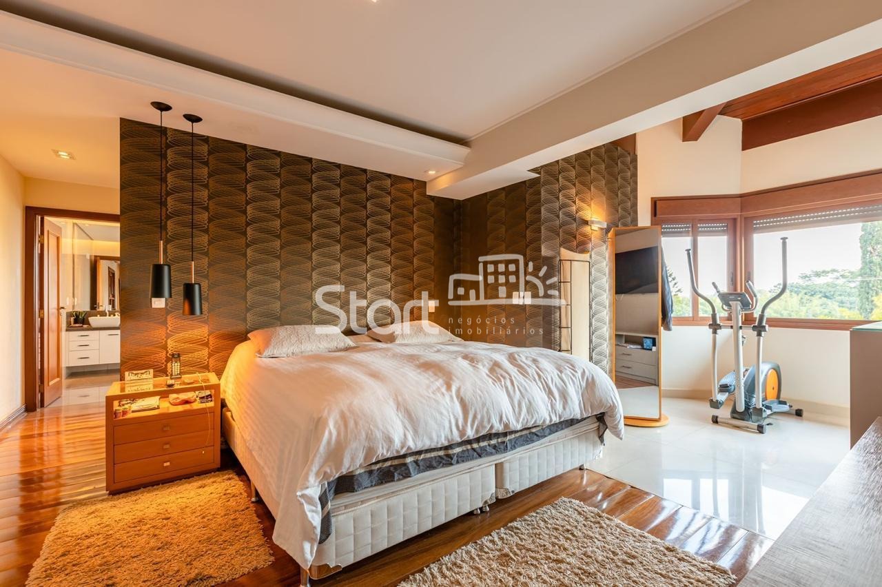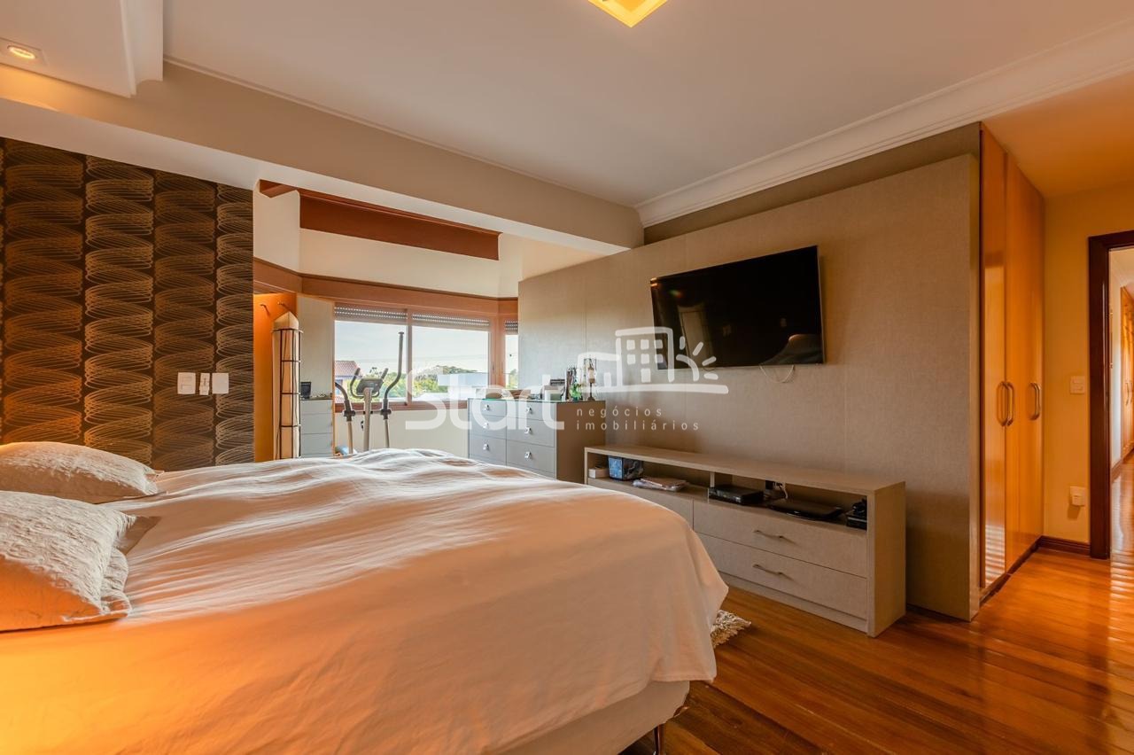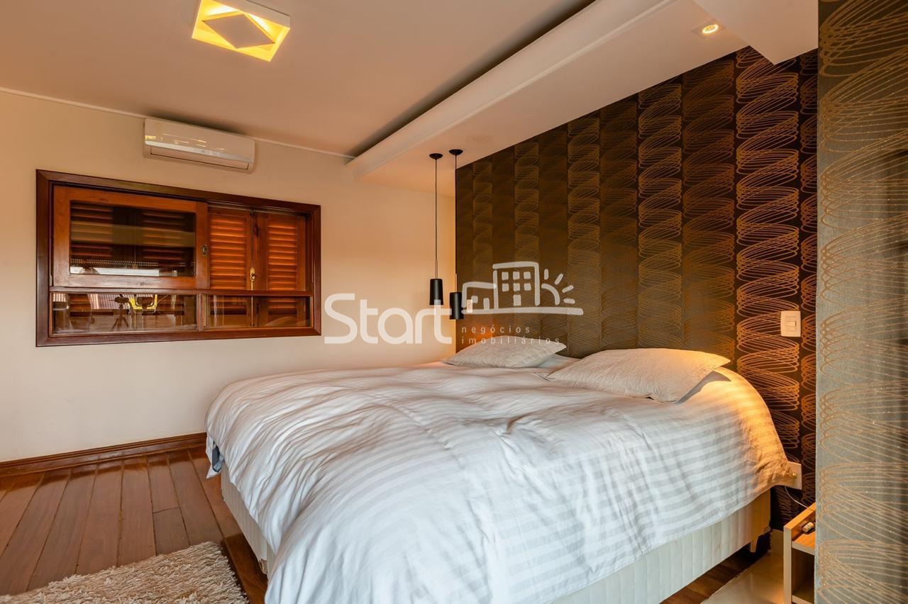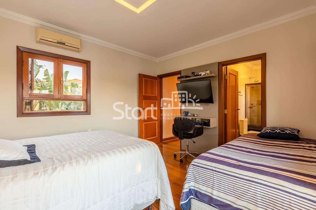 Conta com 3 suítes no piso superior e uma no piso superior, onde também há uma sala de TV e home cinema com acesso a uma ampla varanda.
