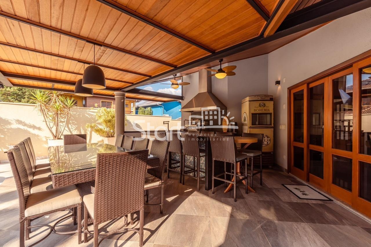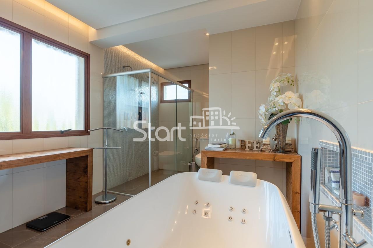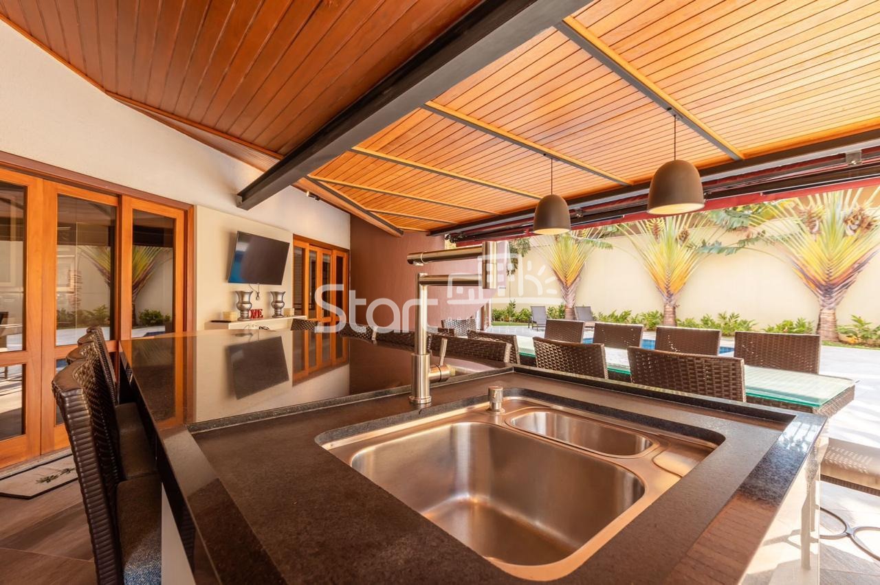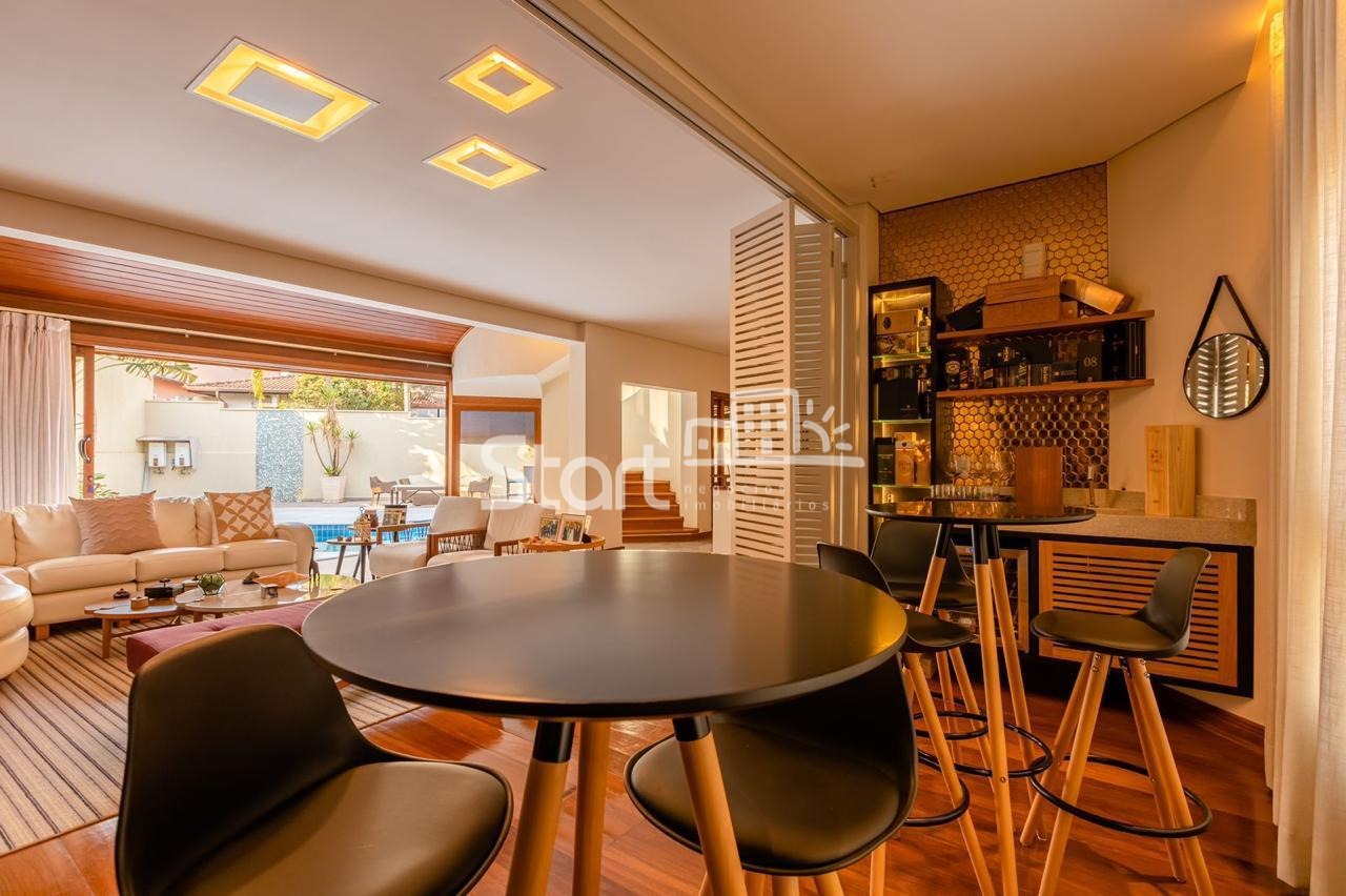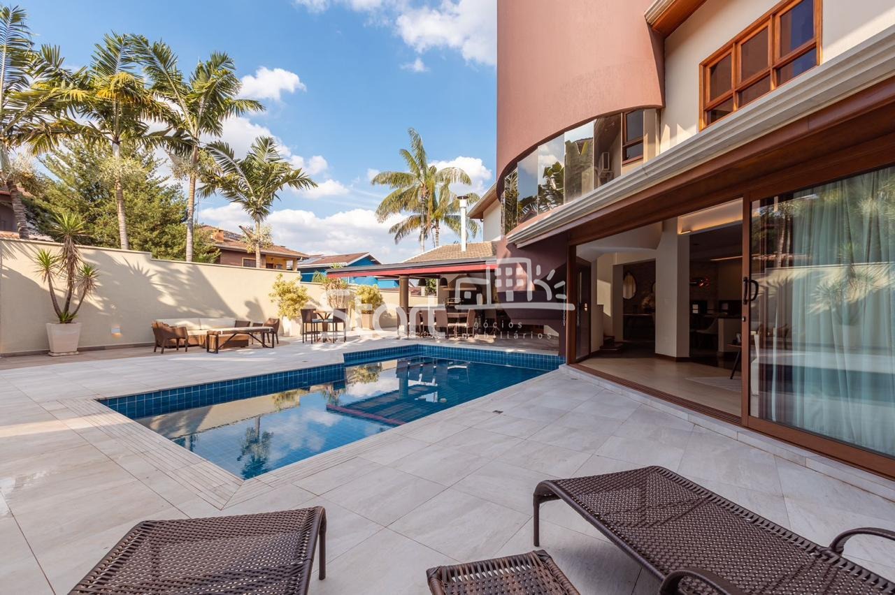 Conta com 3 suítes no piso superior e uma no piso superior, onde também há uma sala de TV e home cinema com acesso a uma ampla varanda.