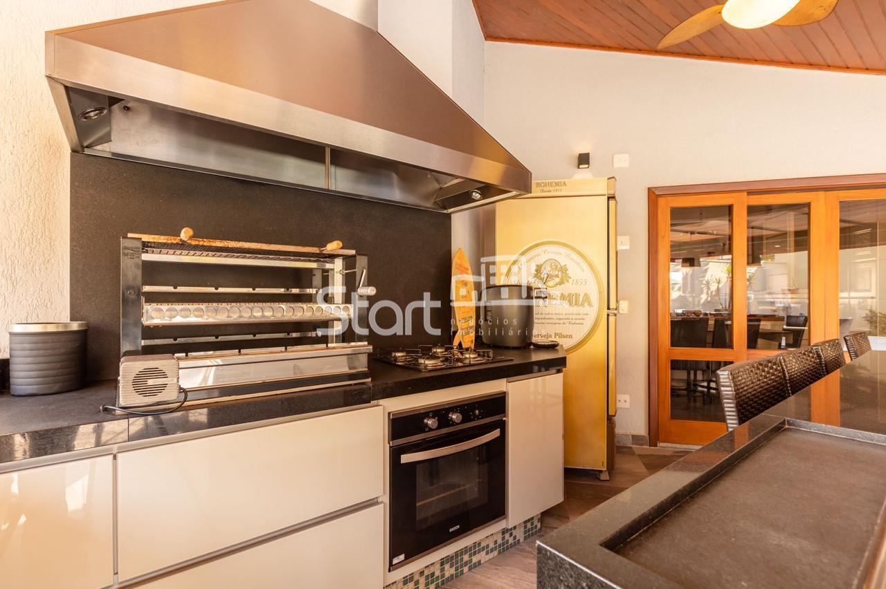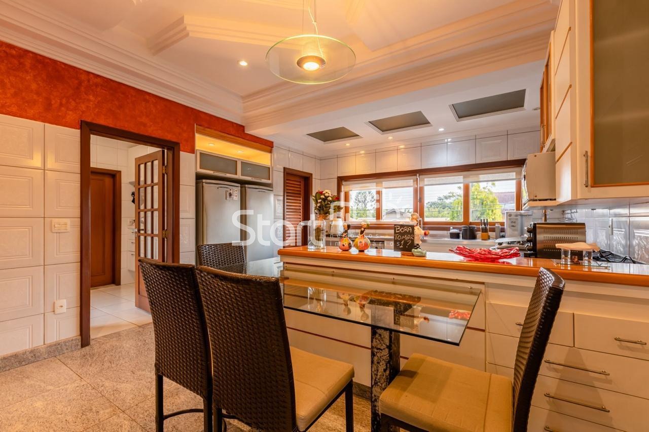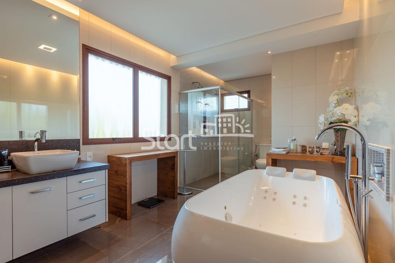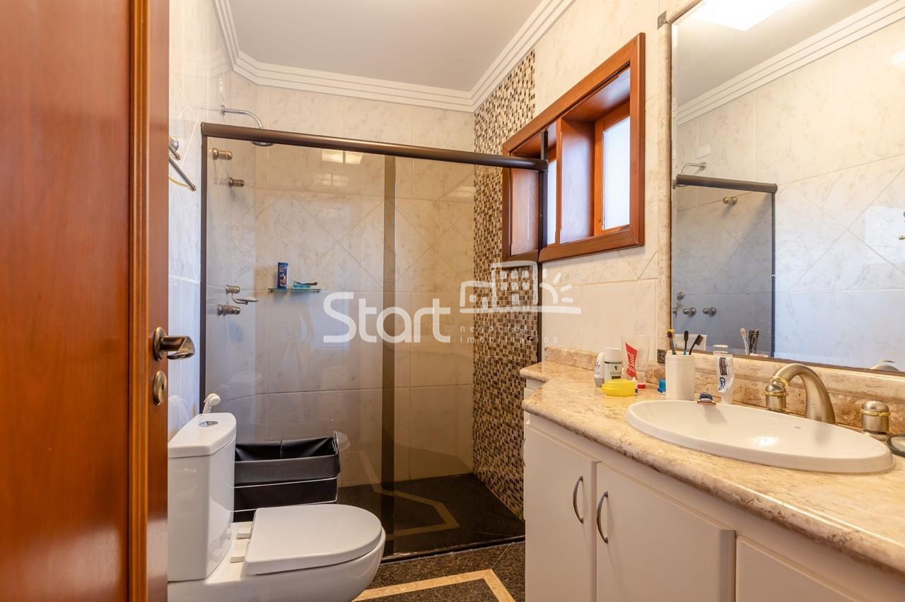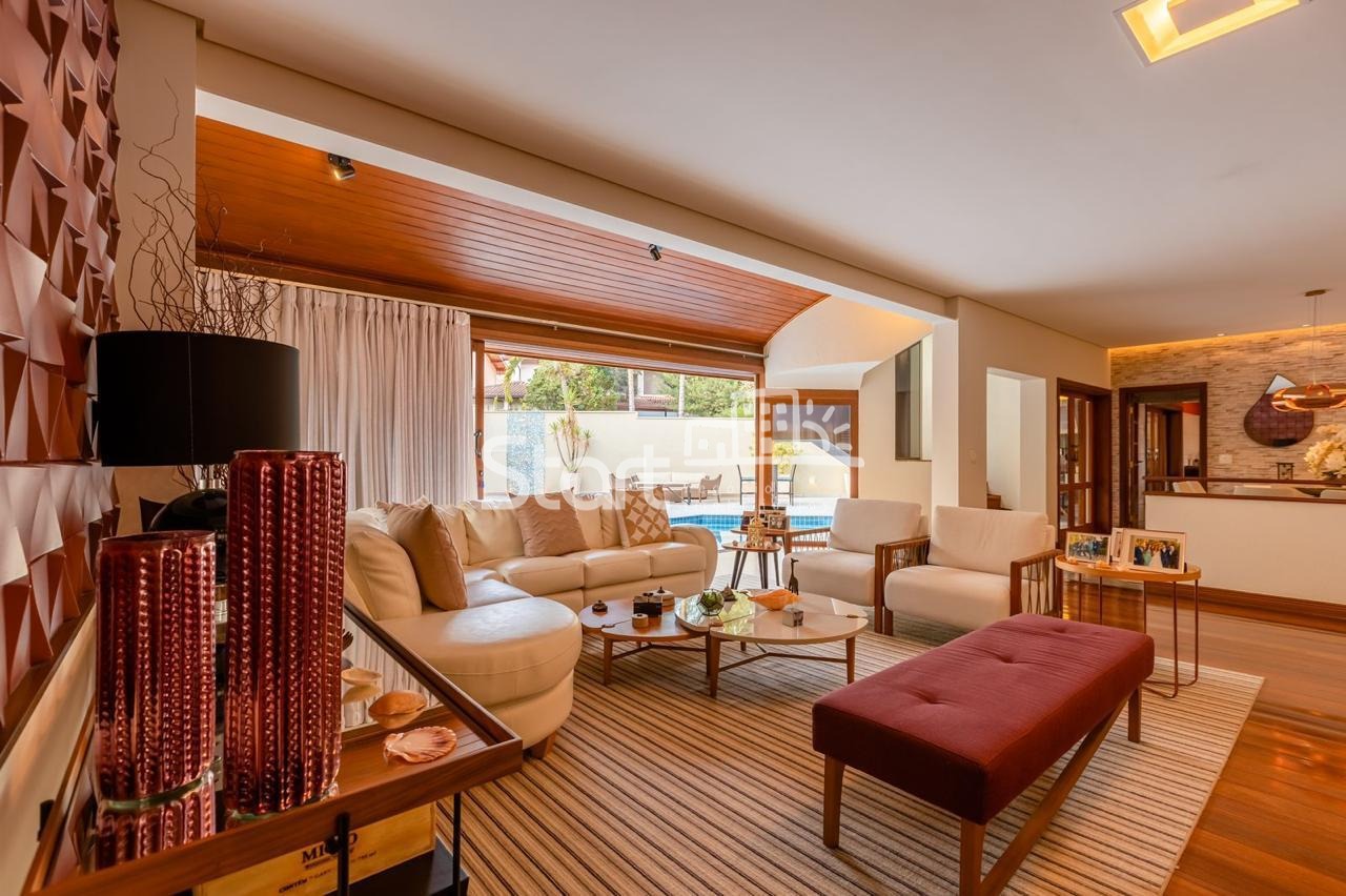 Conta com 3 suítes no piso superior e uma no piso superior, onde também há uma sala de TV e home cinema com acesso a uma ampla varanda.