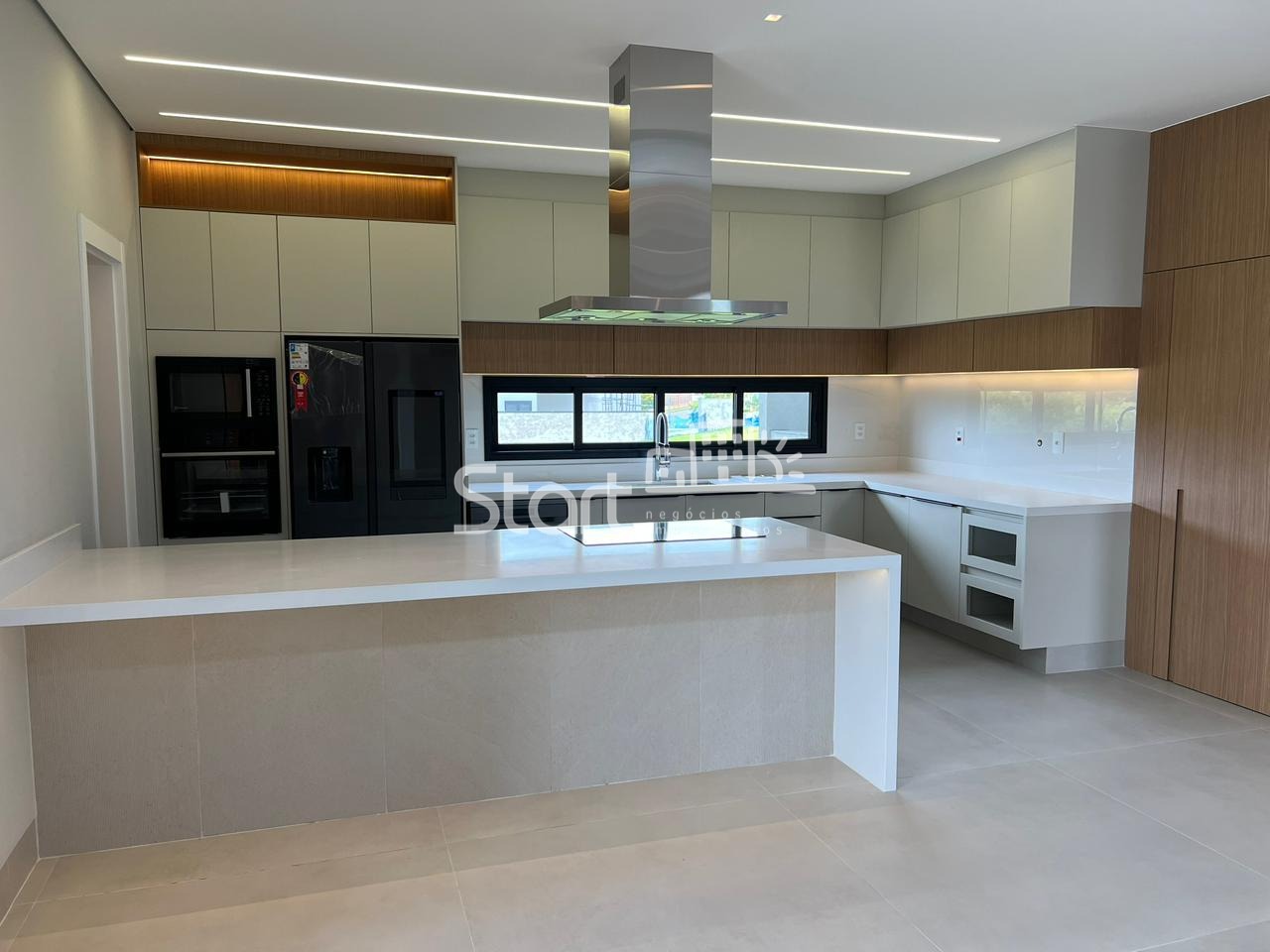 Piso vinílico no pavimento superior: Tarkett, fachada com pedra moledo, bancadas em quartzo branco nos banheiros, cozinha e escada, granito preto São Gabriel escovado no gourmet.