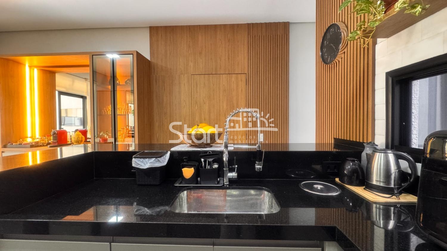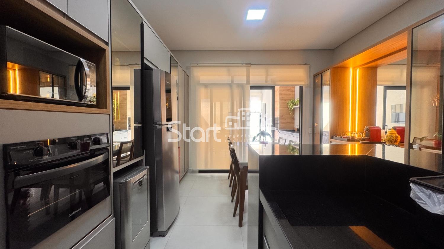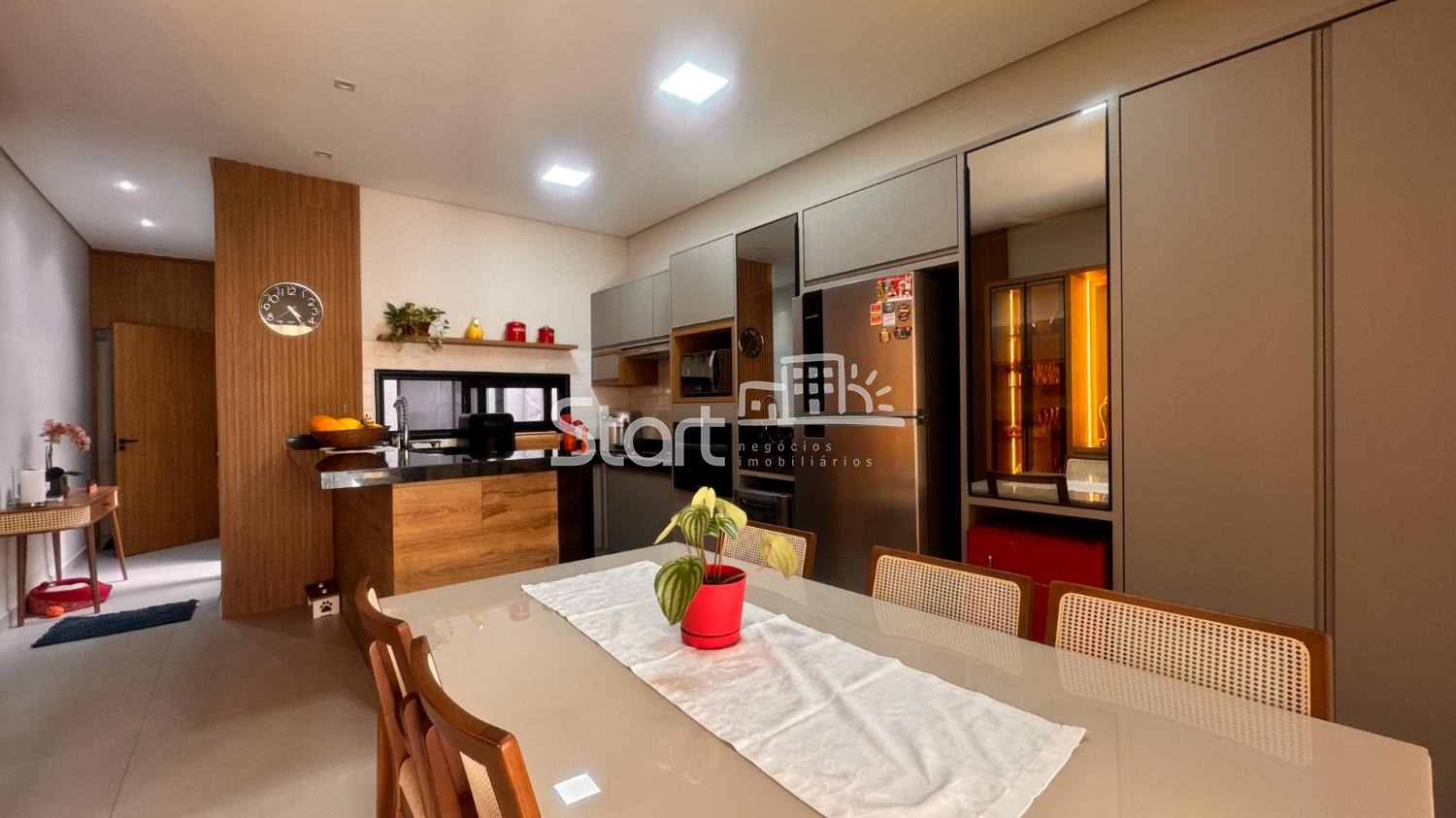 O living com pé-direito elevado integra-se harmoniosamente ao lavabo. A cozinha planejada, integrada à sala de jantar, cria um ambiente funcional e acolhedor. A área gourmet, também integrada, conta com banheiro de apoio, sendo ideal para receber convidados.