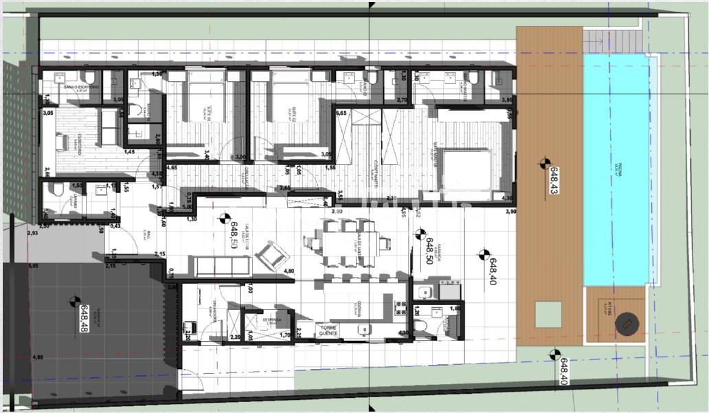 São 4 Suítes plenas, garantindo privacidade absoluta. A Suíte Master conta com amplo closet. Possui Home Office dedicado com banheiro exclusivo (reversível para 5ª suíte).