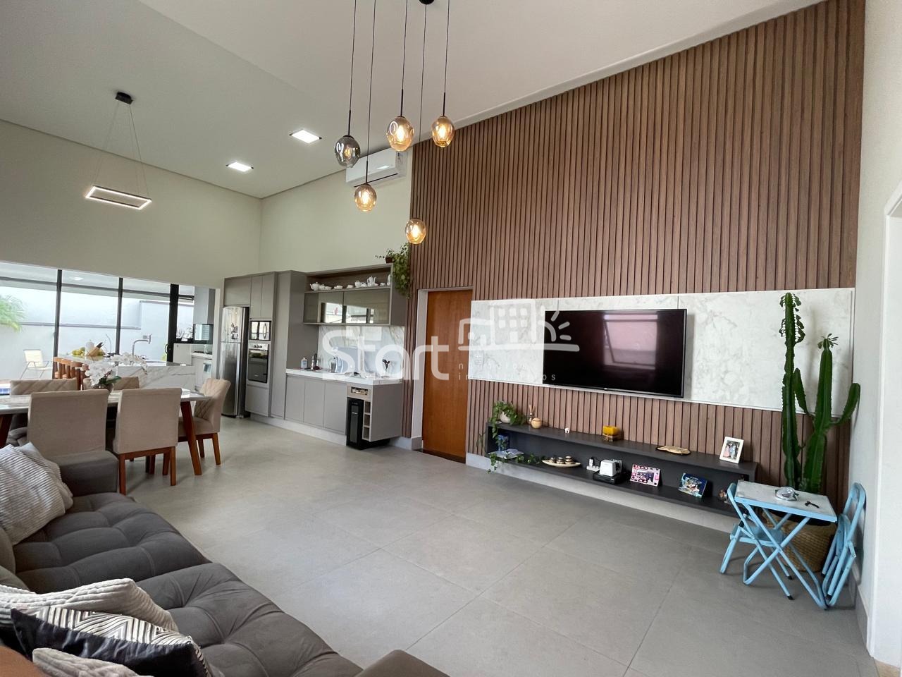 Sala principal espaçosa com painel ripado e ar-condicionado