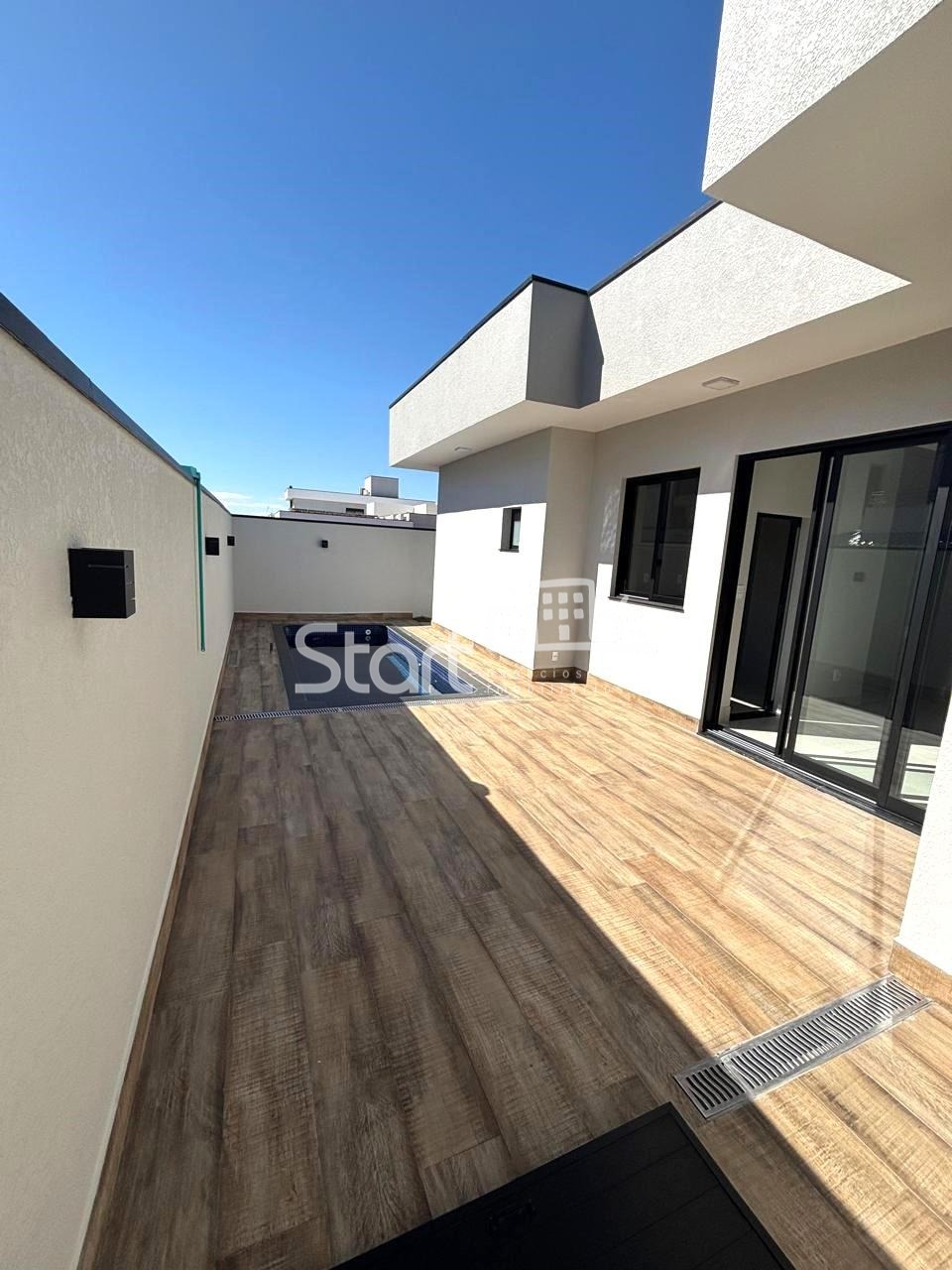 Quintal com piscina, sistema pronto para aquecimento e cascata.
