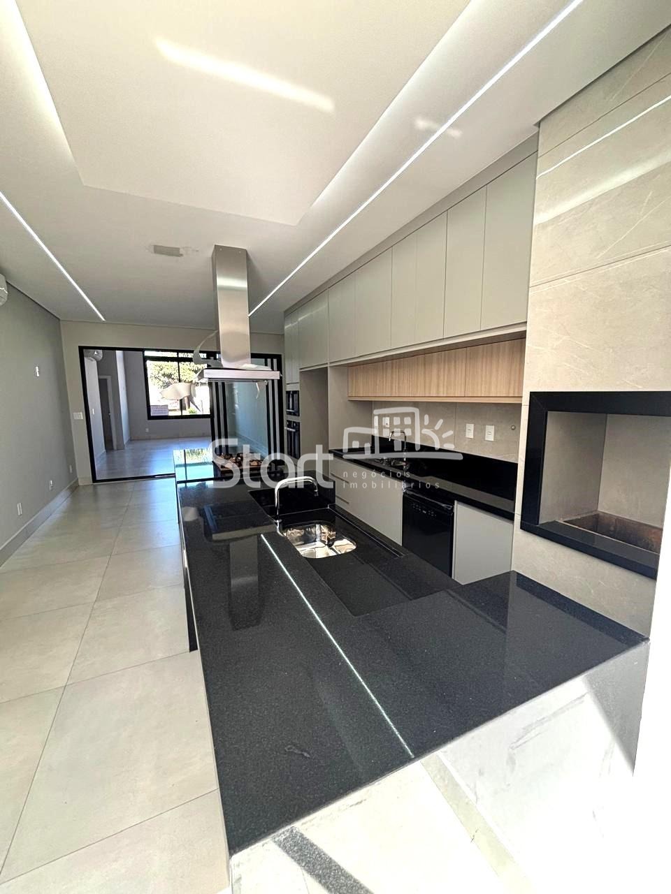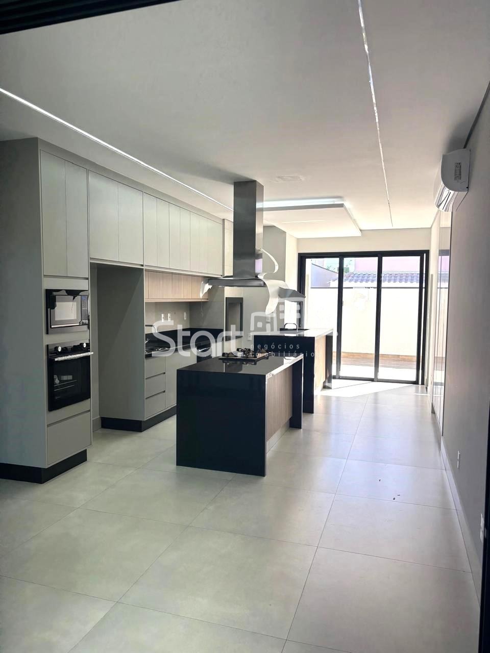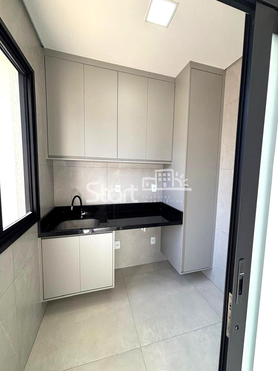 Área gourmet com cozinha americana planejada com cooktop, forno, micro-ondas, coifa e máquina de lavar louças, área de serviço integrada com armários, balcões em granito.