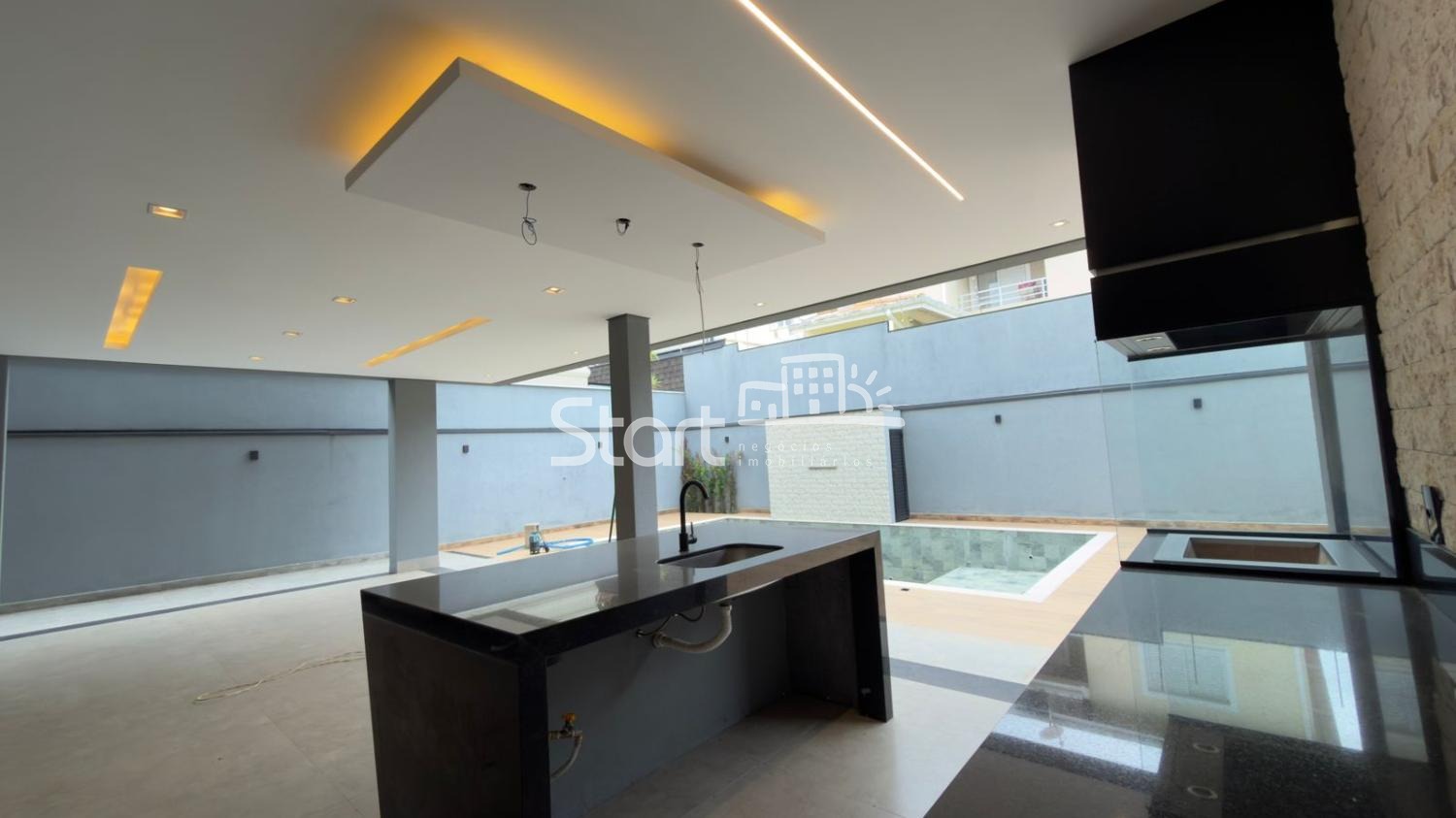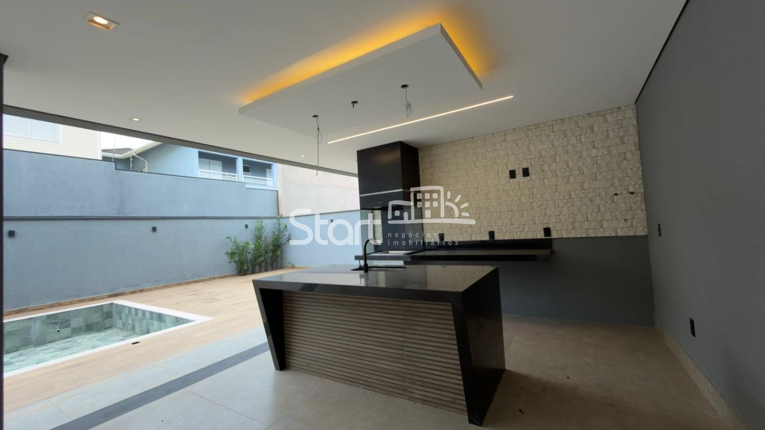 - Área Gourmet ampla com churrasqueira e ilha em Granito Preto.