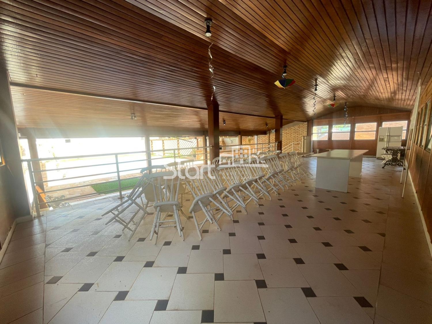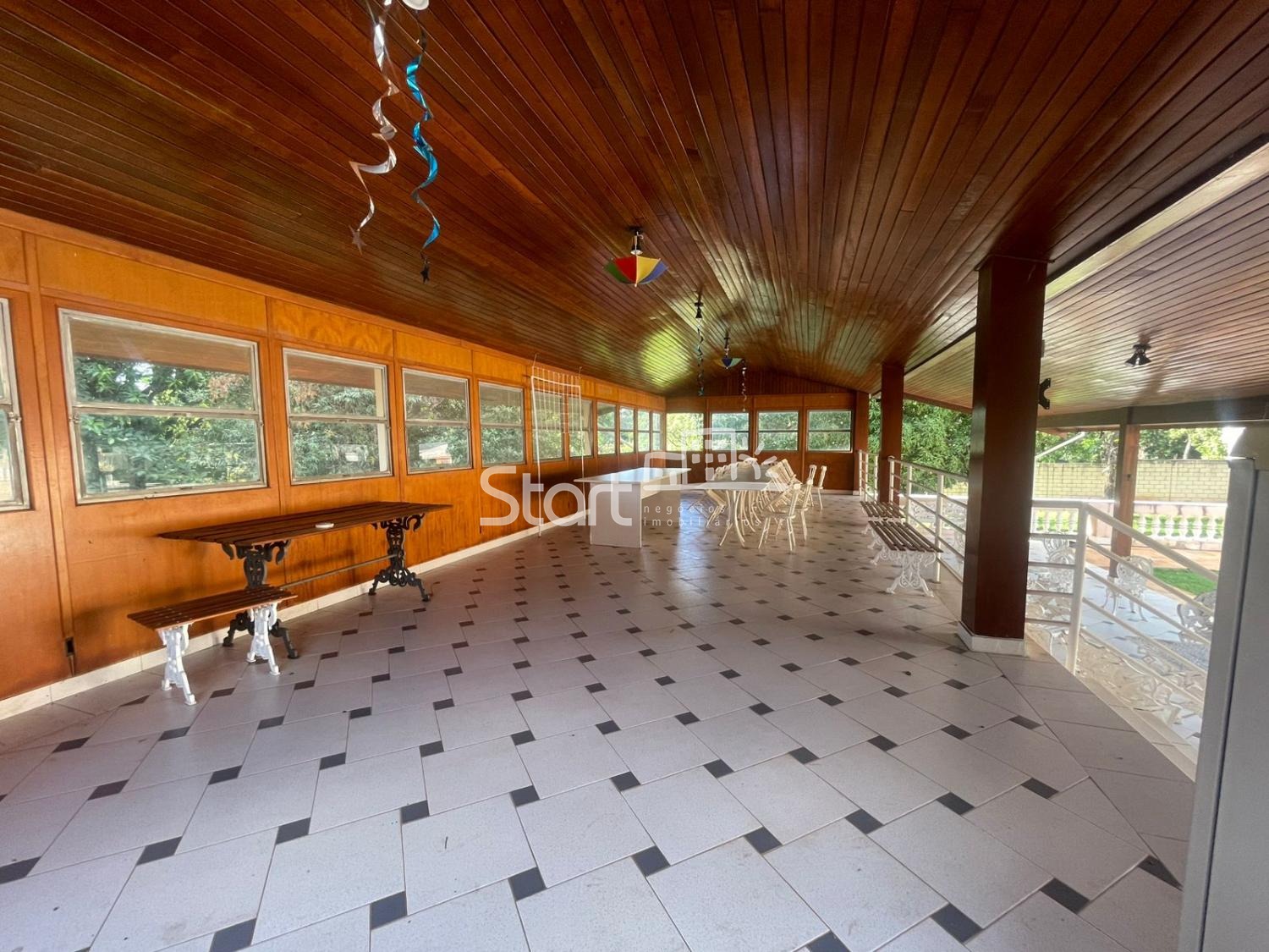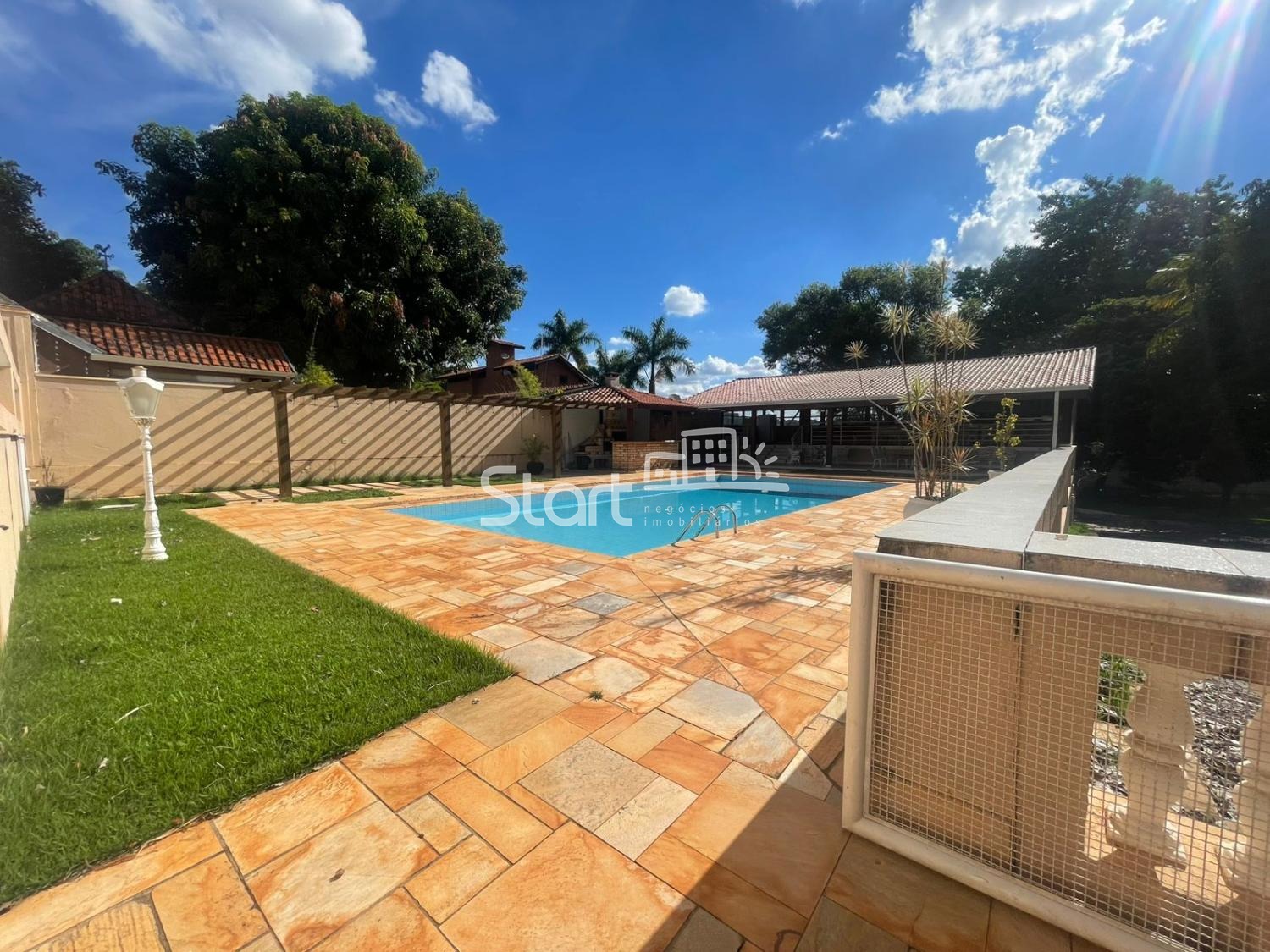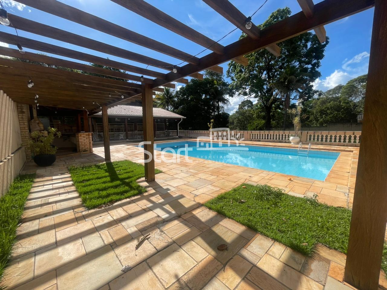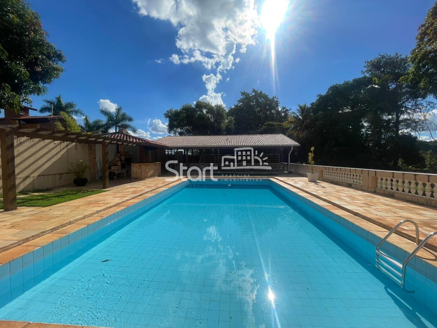 A área interna é distribuída de forma funcional e confortável, contando com sala de TV, sala de estar, sala de jantar e cozinha ampla, perfeita para atender tanto o uso residencial quanto eventos de médio e grande porte. São 5 suítes espaçosas, garantindo conforto e privacidade para moradores e convidados.