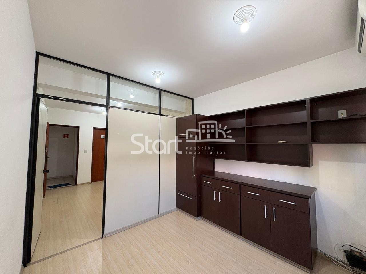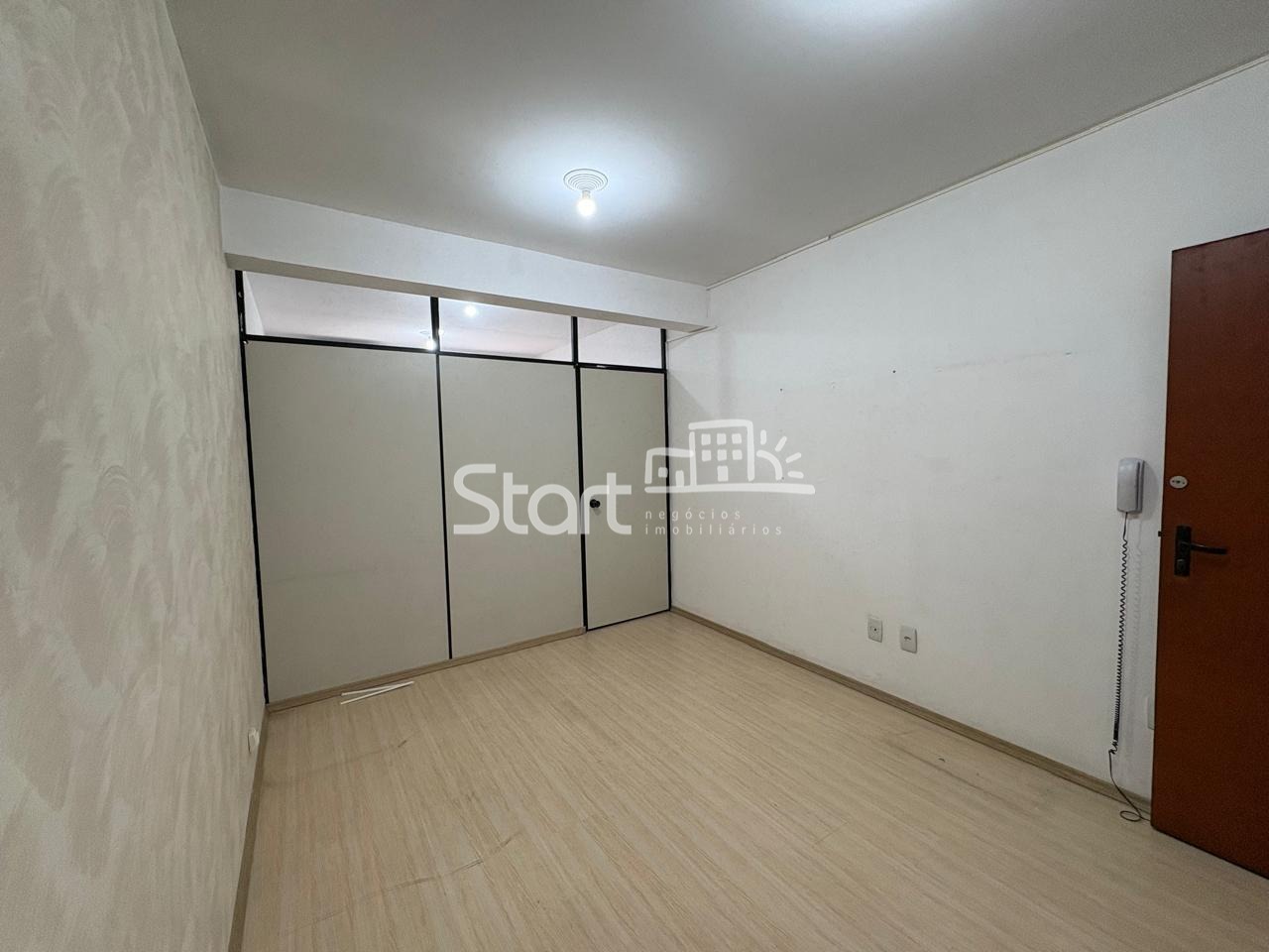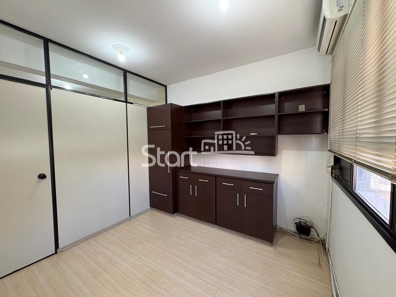 Ampla sala com divisória, ar-condicionado, armário e banheiro. O prédio oferece porteiro em horário comercial.