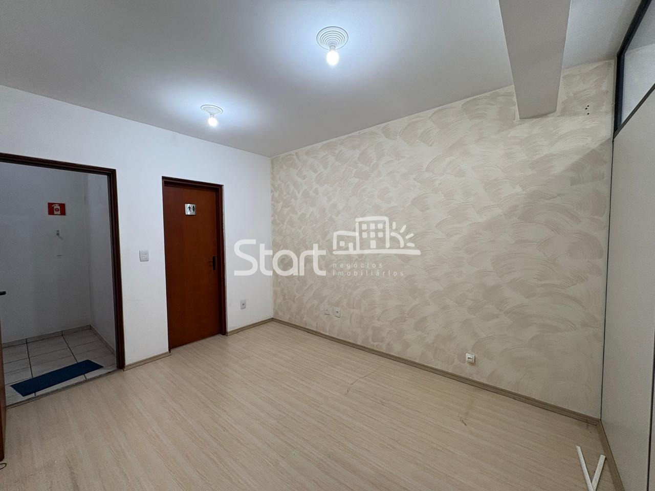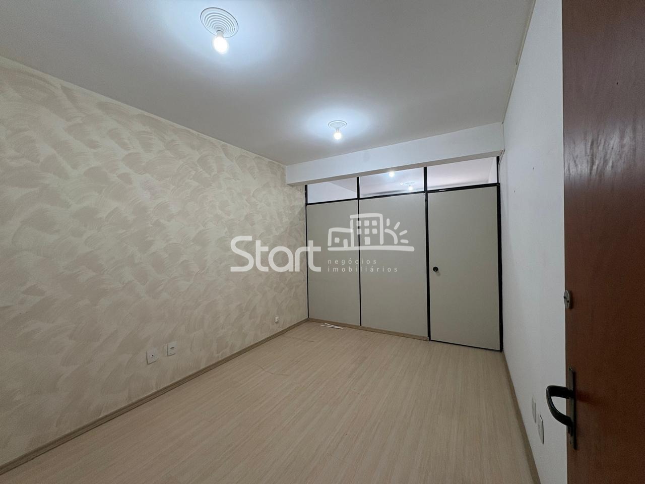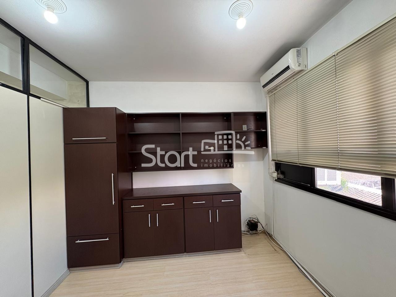 Ampla sala com divisória, ar-condicionado, armário e banheiro. O prédio oferece porteiro em horário comercial.