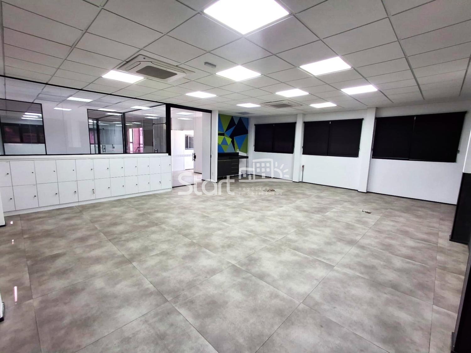 2º andar: 151,5 m², distribuídos em 4 salas, 2 banheiros e copa. A sala principal conta com armários individualizados com chaves.