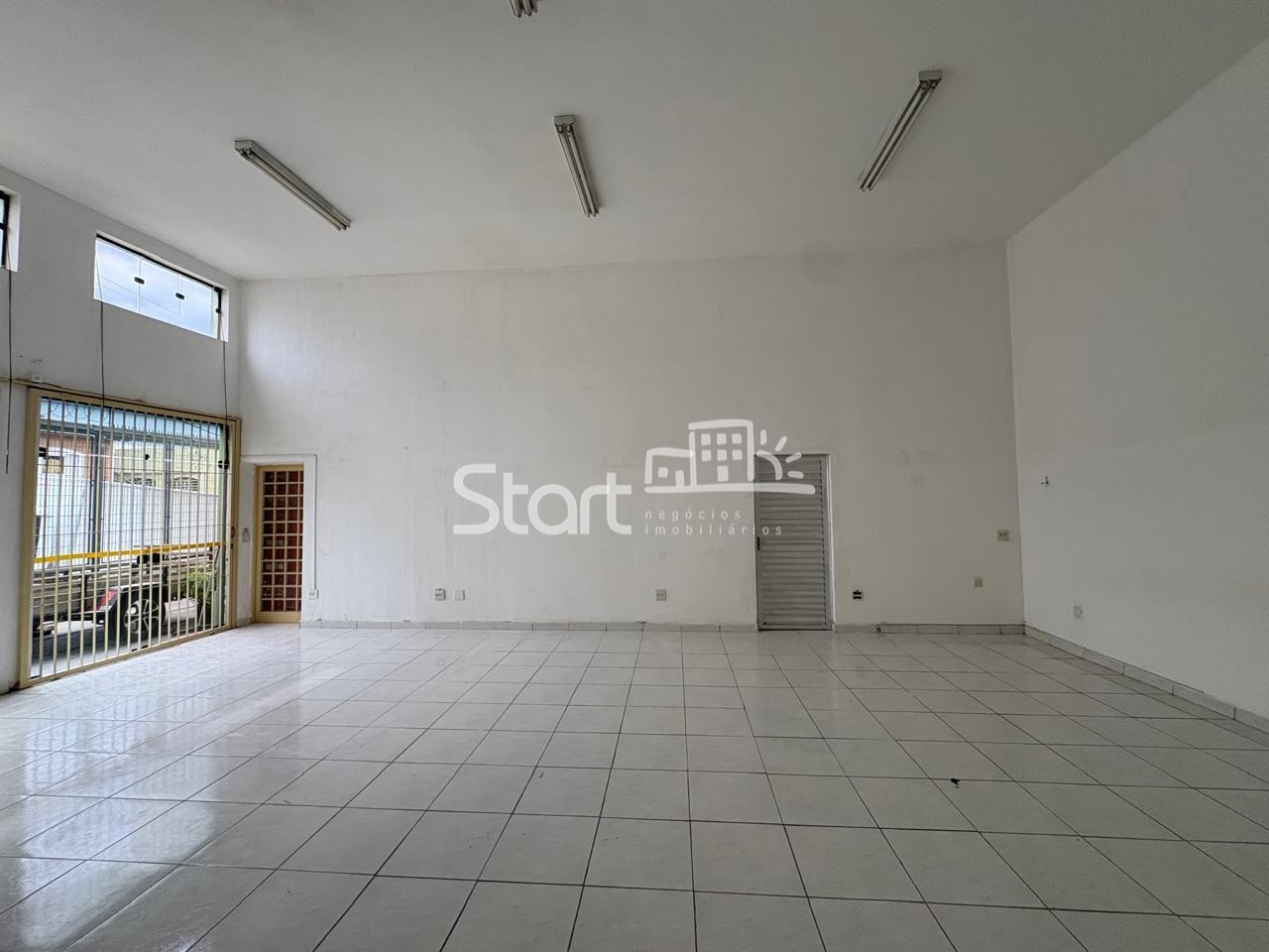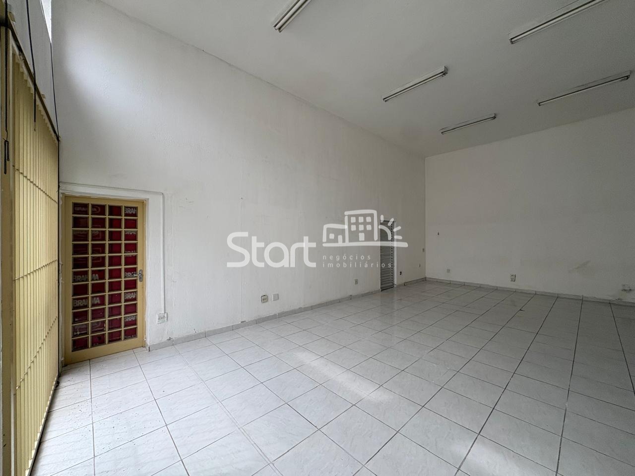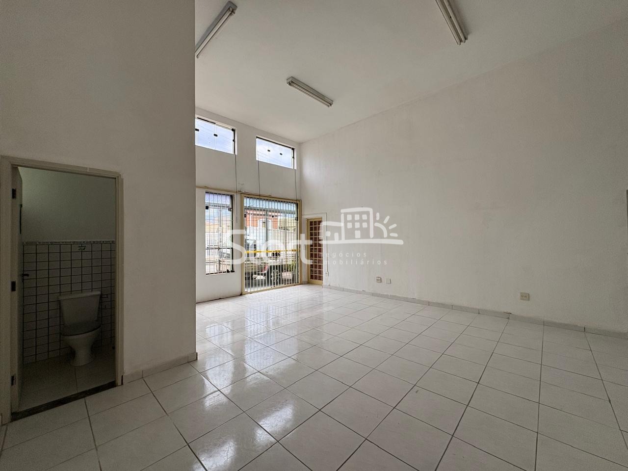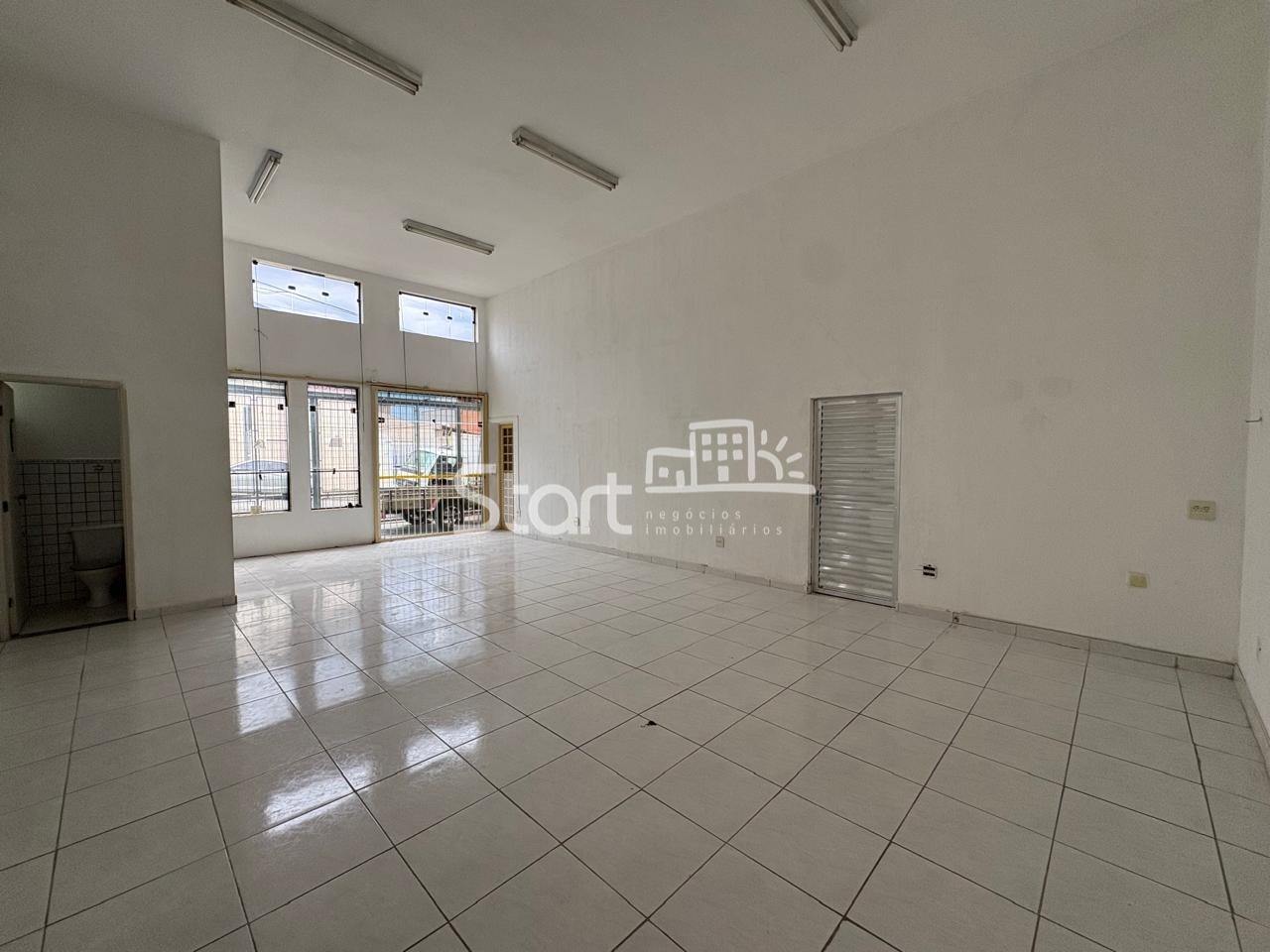 Ampla sala com 60 m2, 2 banheiros, pé direito alto e piso cerâmico.