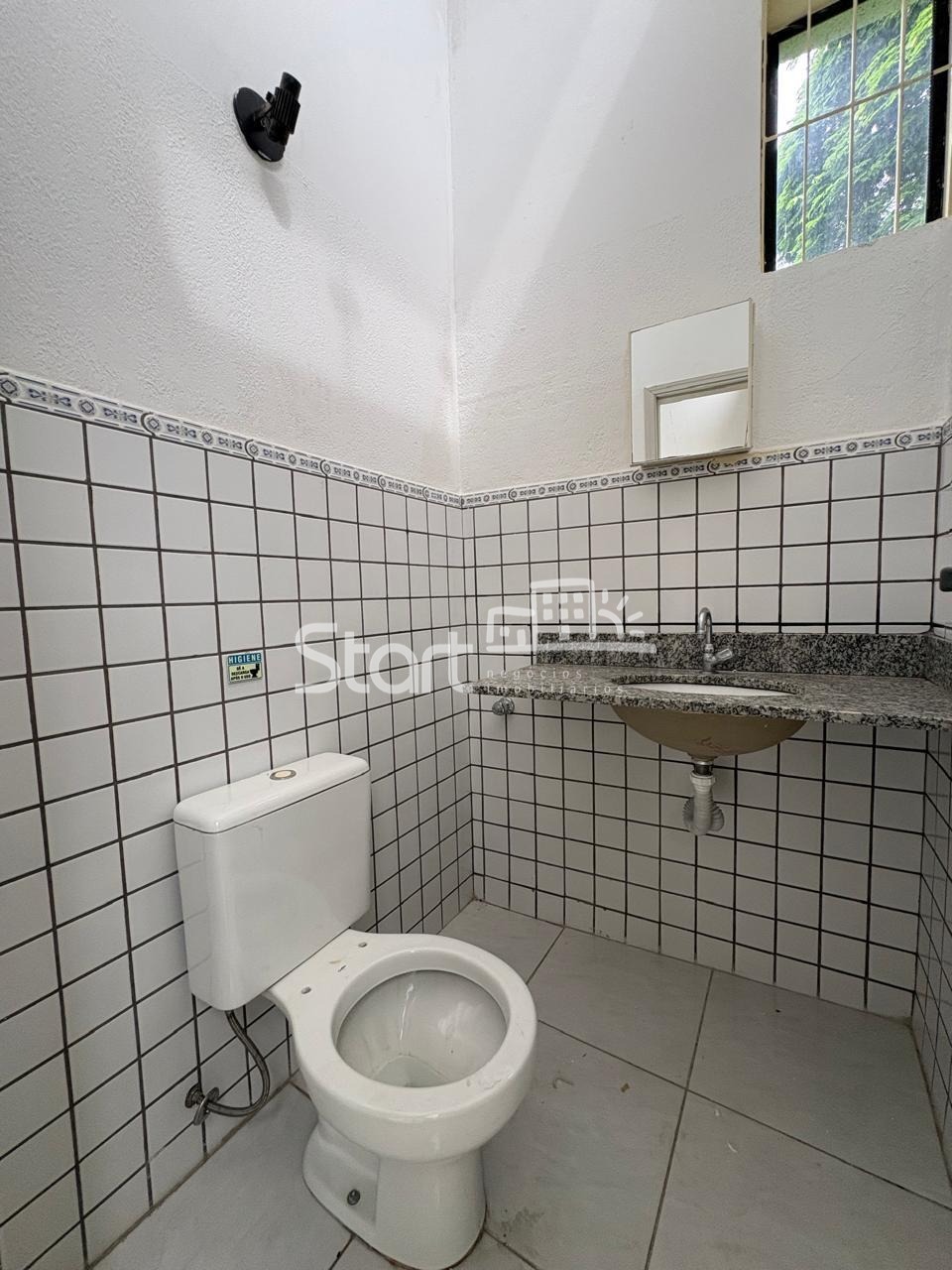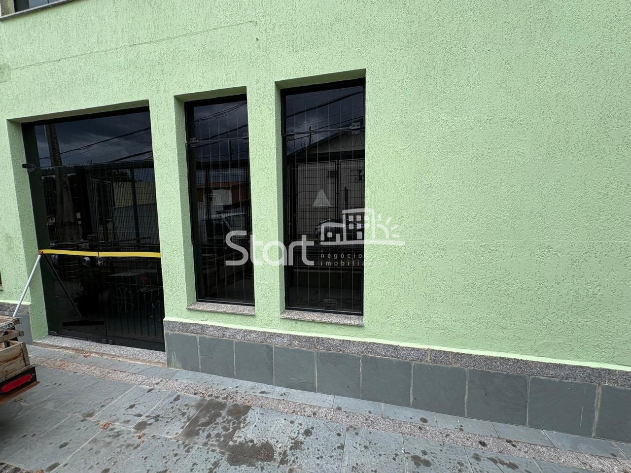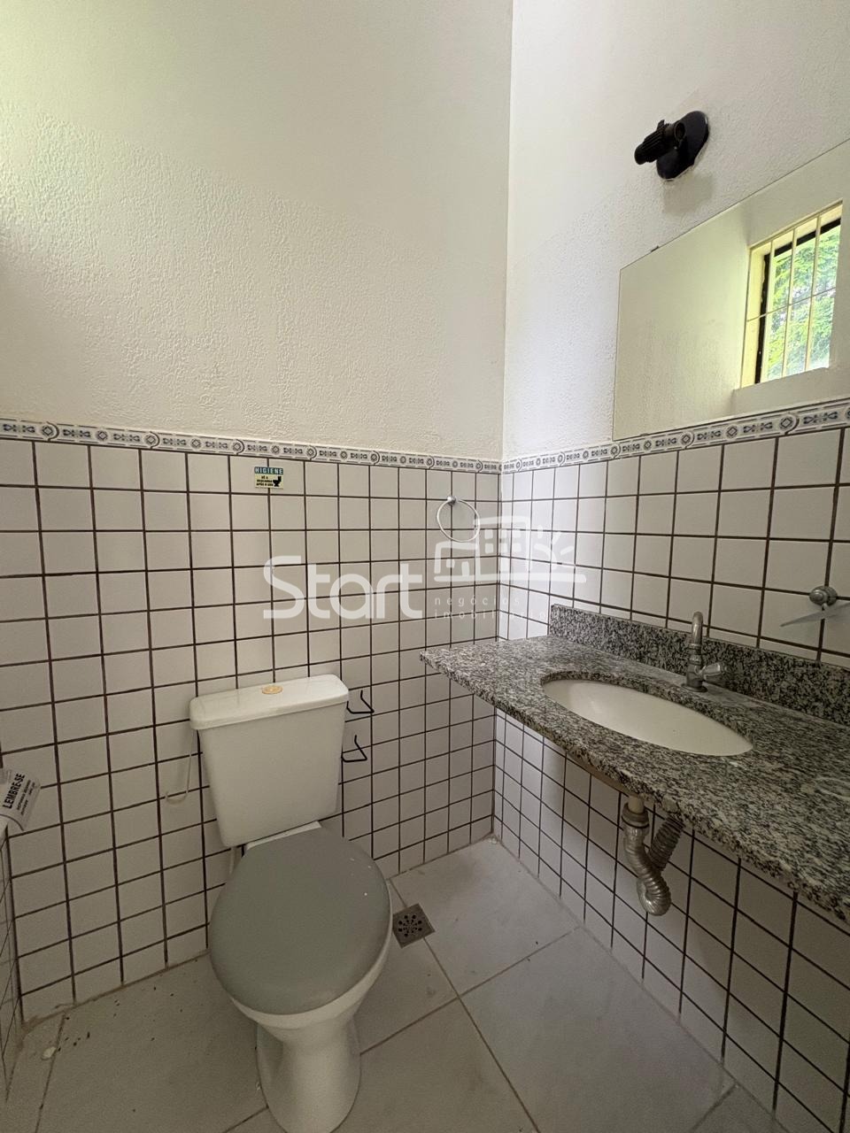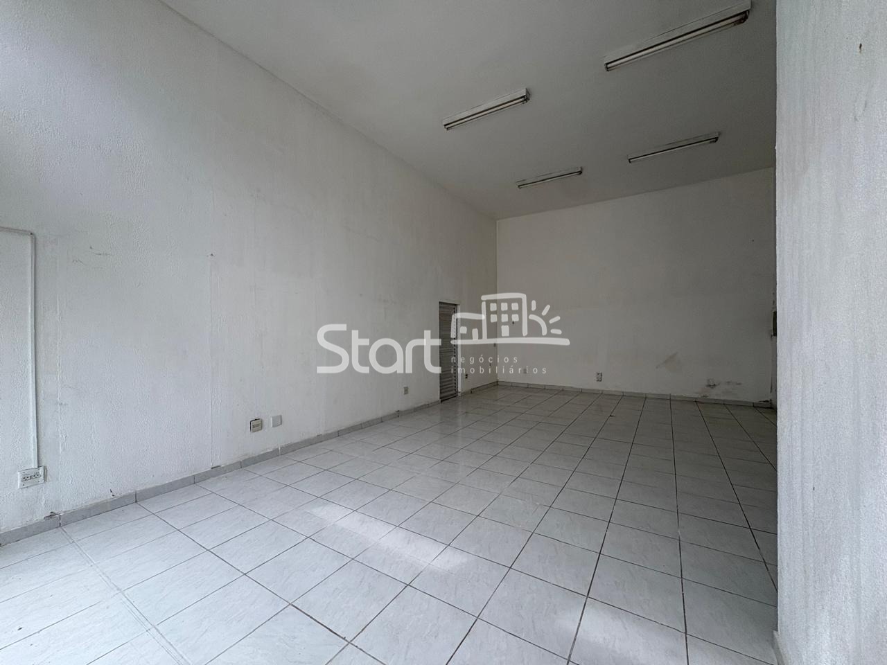 Ampla sala com 60 m2, 2 banheiros, pé direito alto e piso cerâmico.